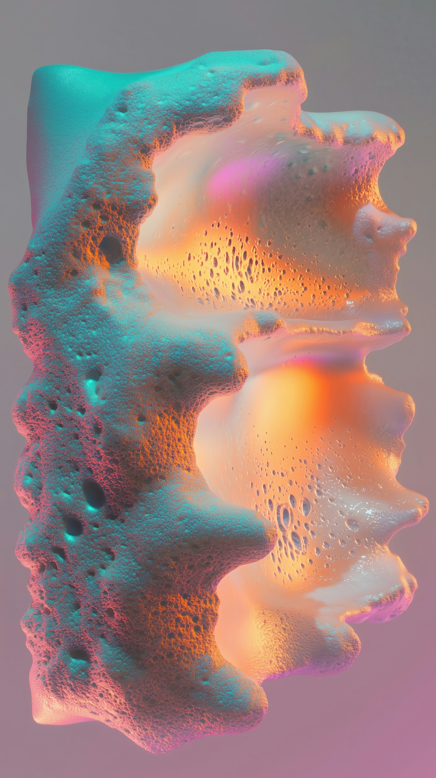 A glowing, coral-like 3D abstract structure with vibrant teal, orange, and pink hues against a soft gradient background.
