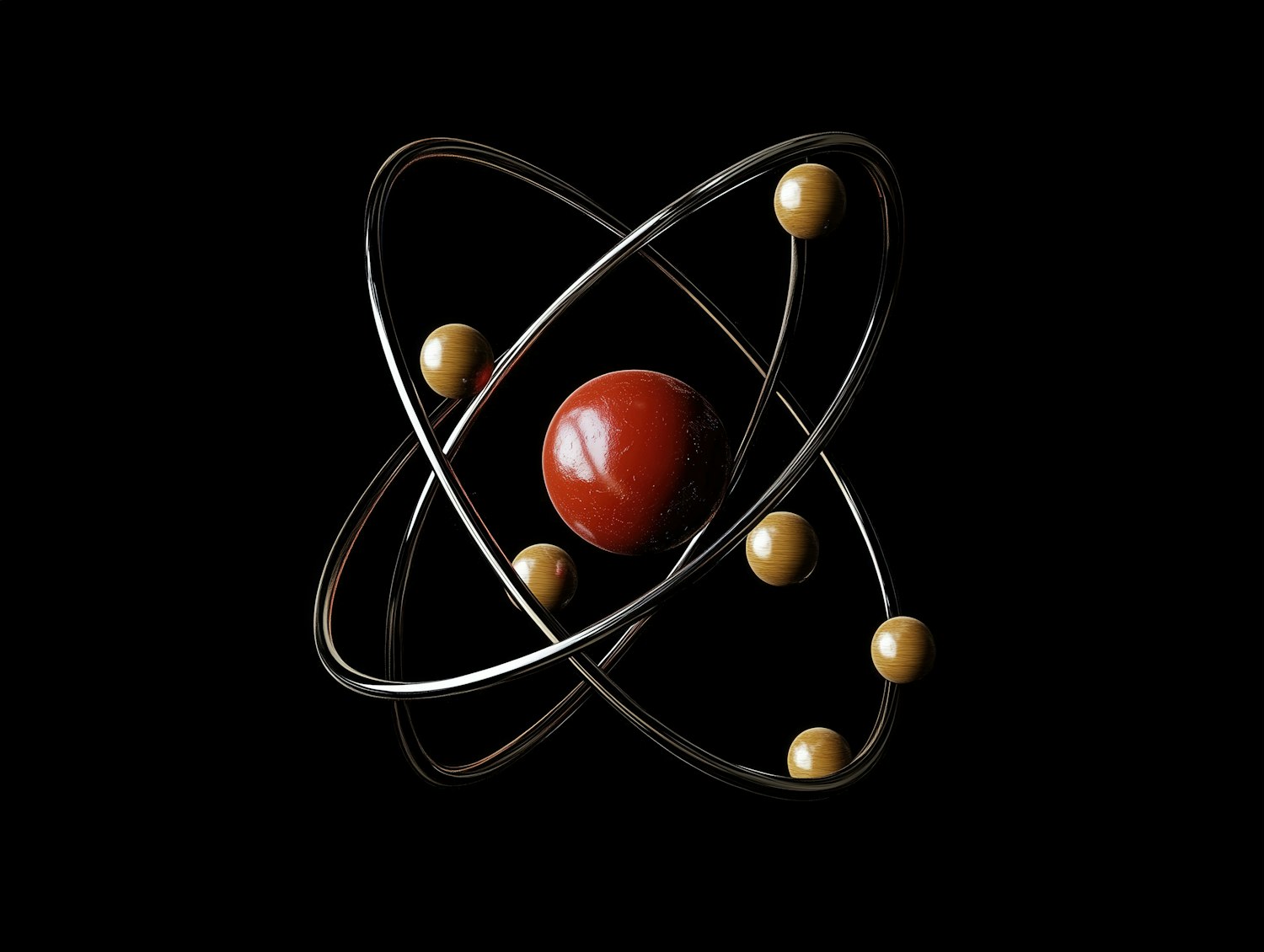 A sleek 3D model of an atom with a red nucleus and golden electrons orbiting on metallic paths, set against a black background.