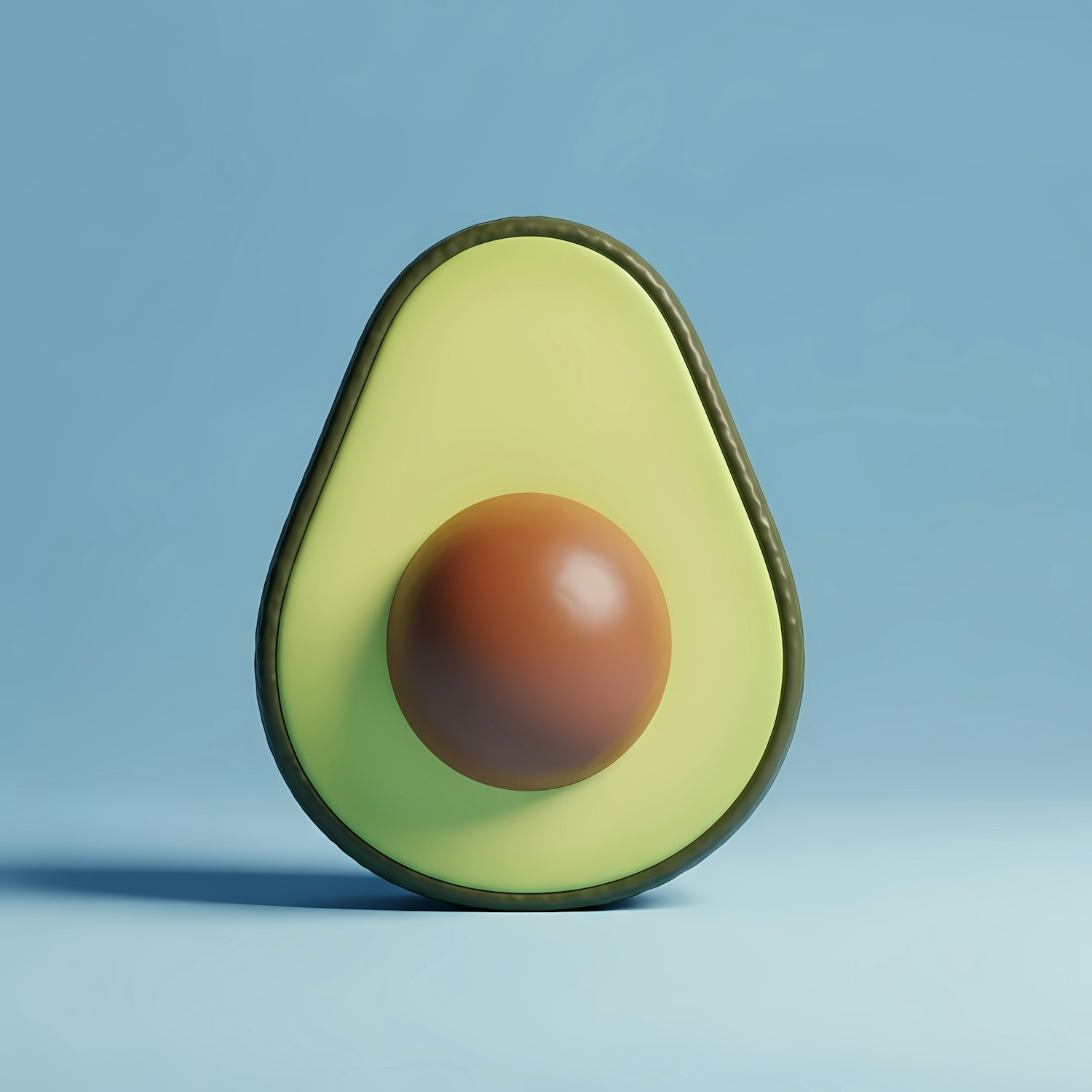 A vibrant 3D-rendered avocado half with a brown pit, set against a clean blue background. Perfect for food or design themes.