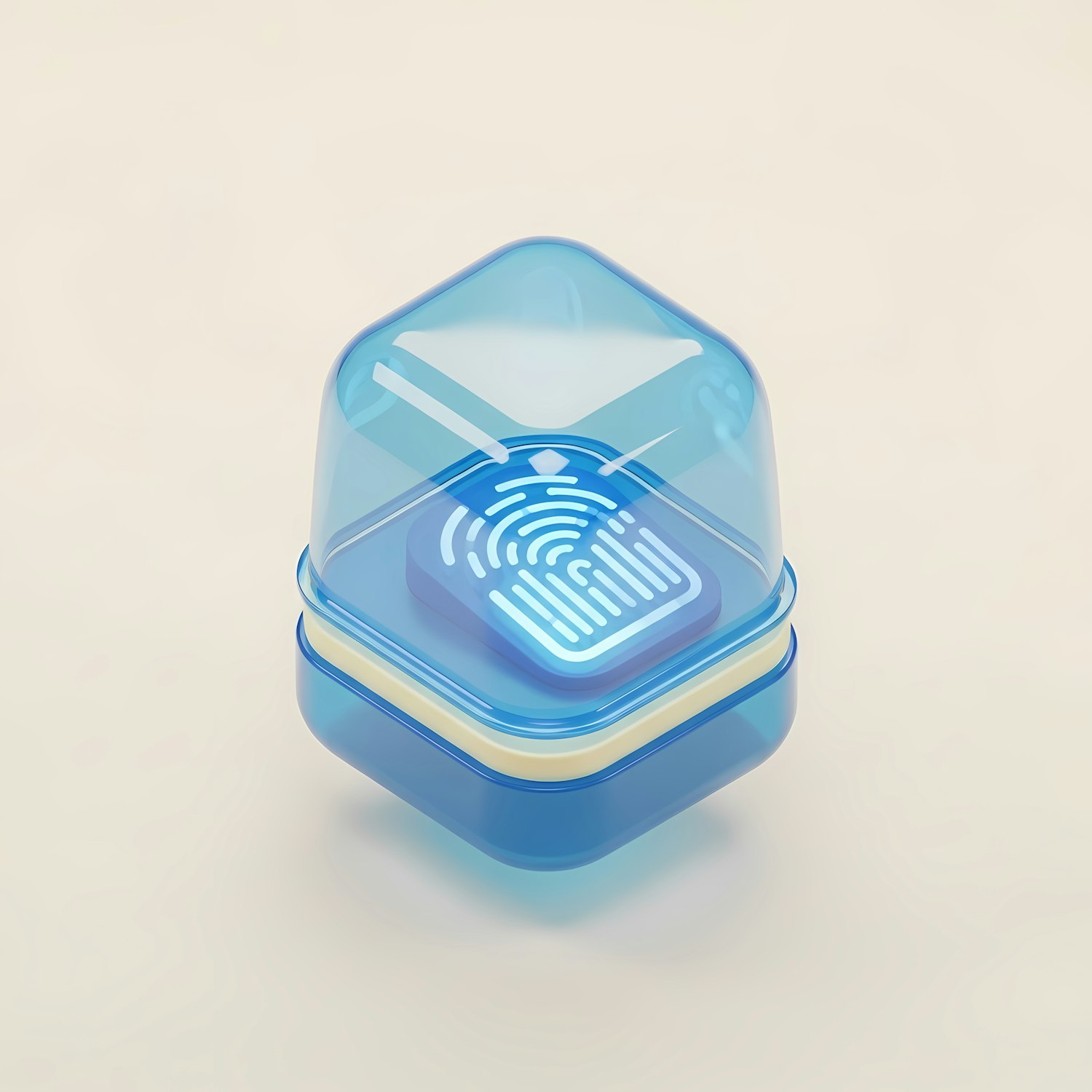 3D illustration of a glowing fingerprint icon encased in a blue translucent cube, symbolizing security and biometric technology.