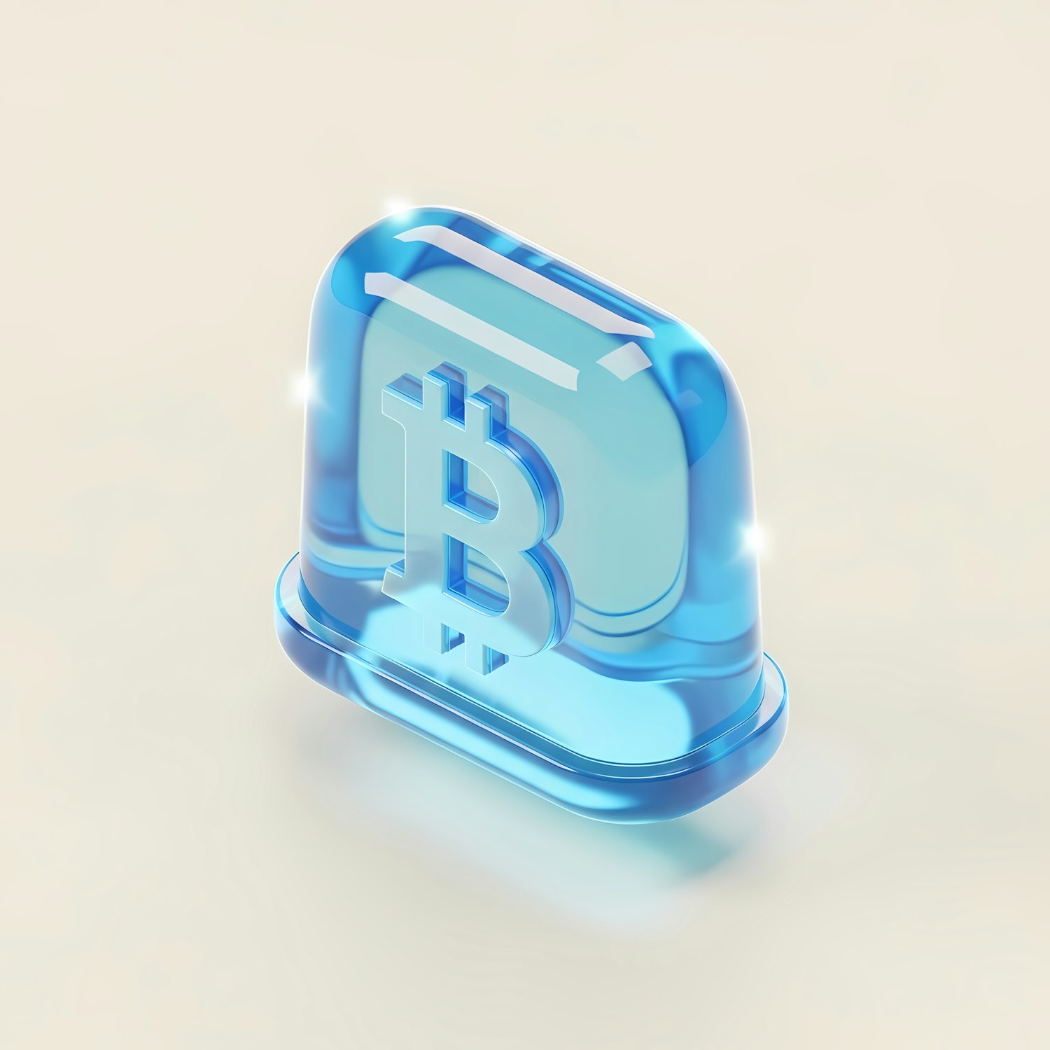 A sleek 3D-rendered translucent blue Bitcoin symbol on a rounded square, set against a minimalist beige background.