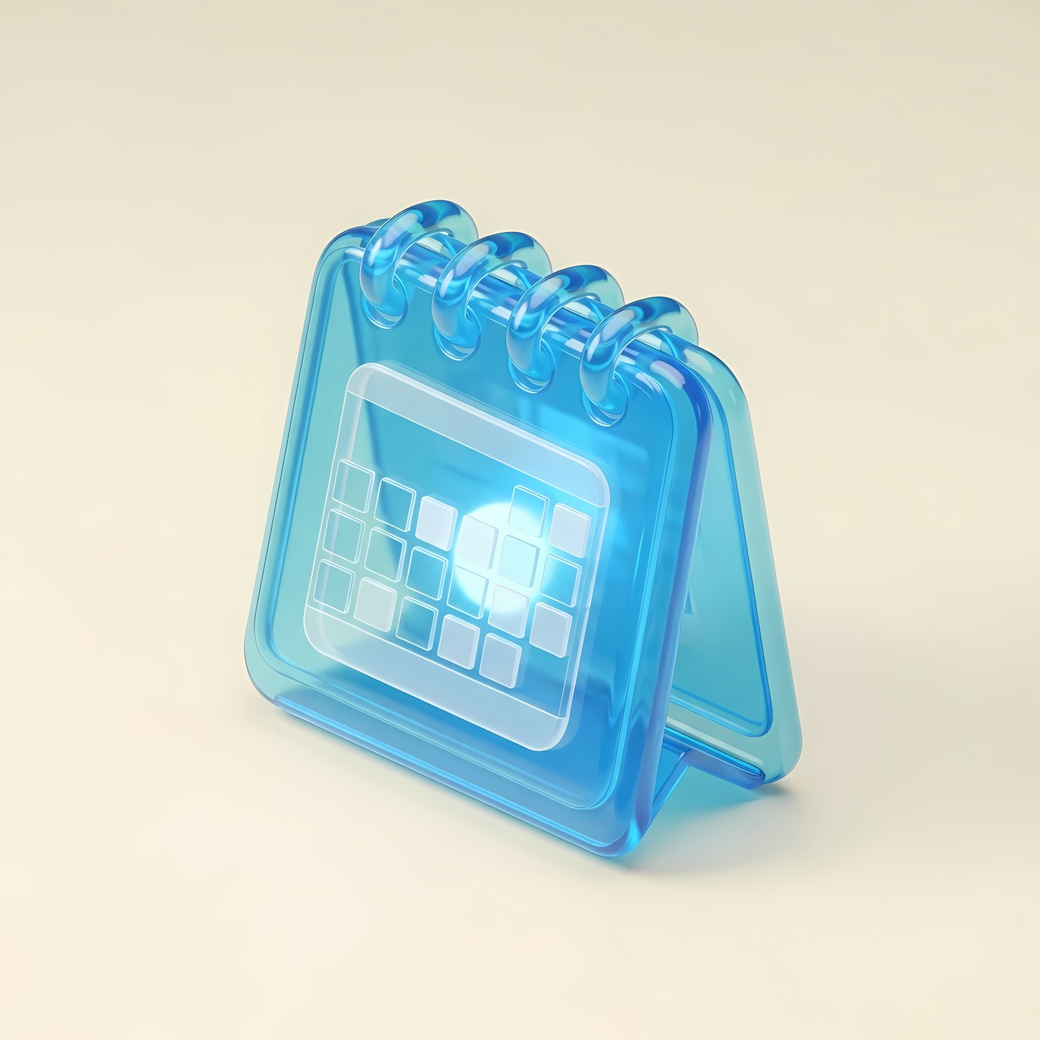 Stylized 3D-rendered translucent blue desk calendar icon with a spiral binding, set against a light beige background.