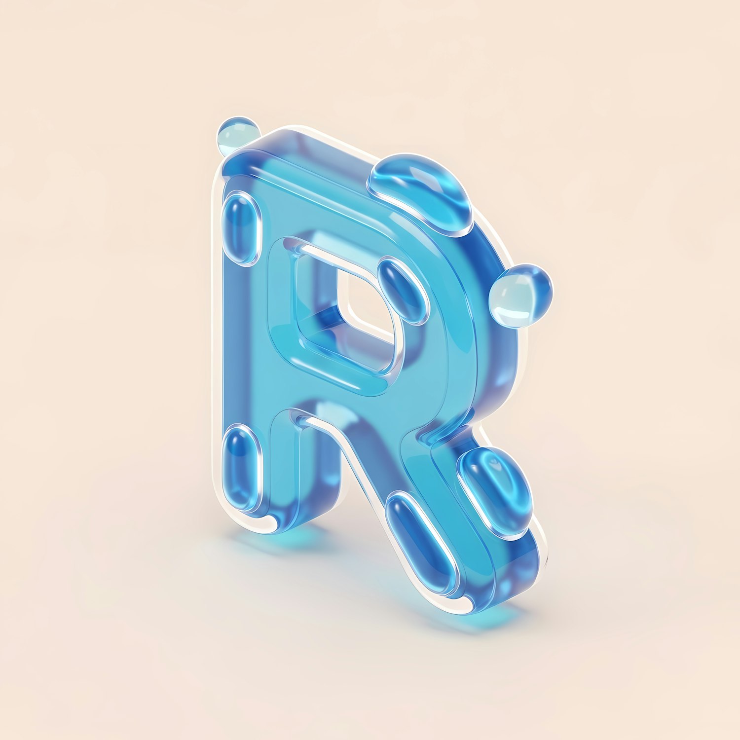 A 3D-rendered translucent blue letter 'R' with water droplet effects on a soft beige background, showcasing a modern and fluid design.