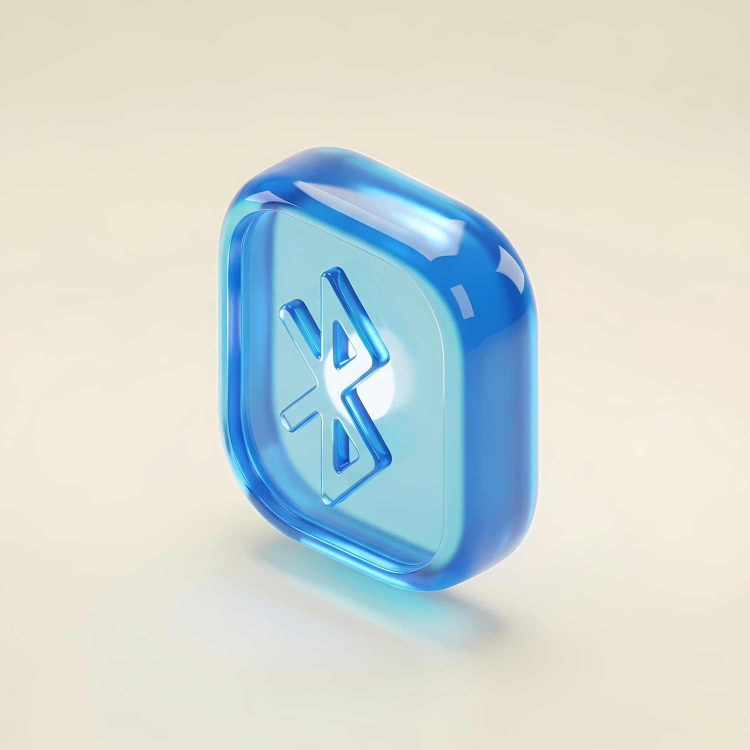 3D-rendered Bluetooth icon in a translucent blue design on a soft beige background, showcasing modern and sleek aesthetics.