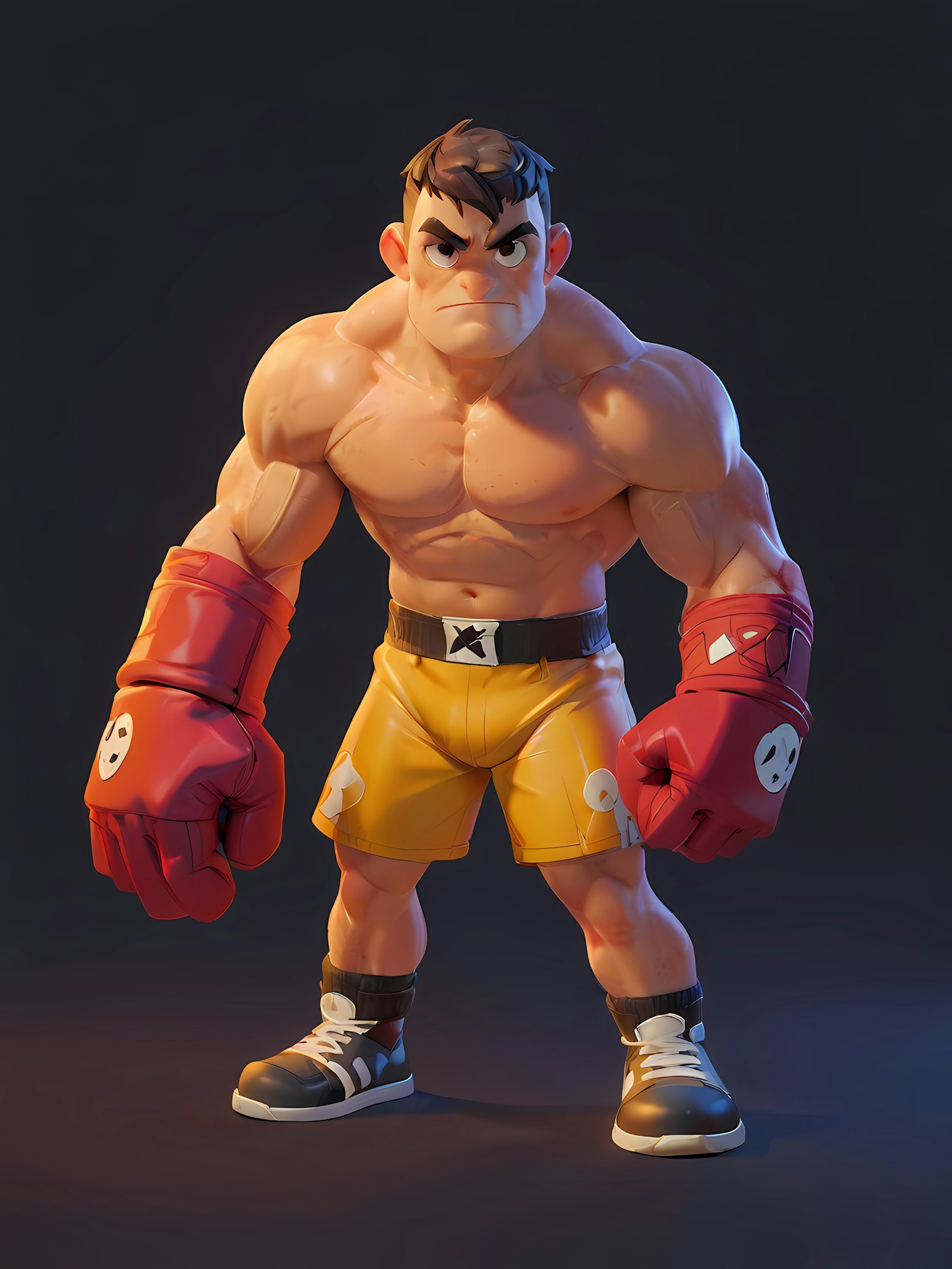 Stylized 3D boxer with yellow shorts, red gloves, and a determined look. Cartoonish design with bold colors and exaggerated features.
