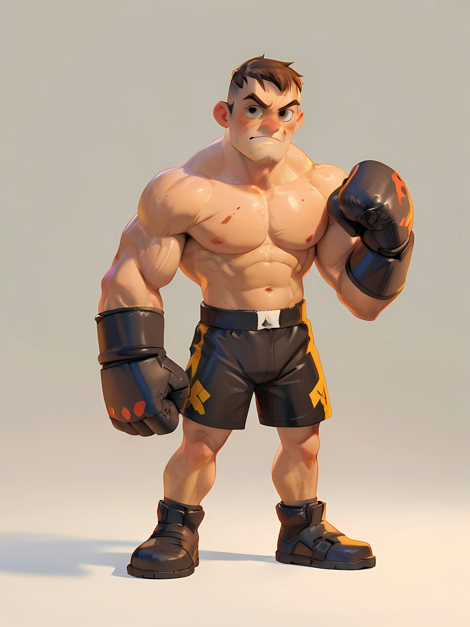 Stylized 3D boxer character with muscular build, black gloves, and yellow-accented shorts, ready for action in a neutral background.