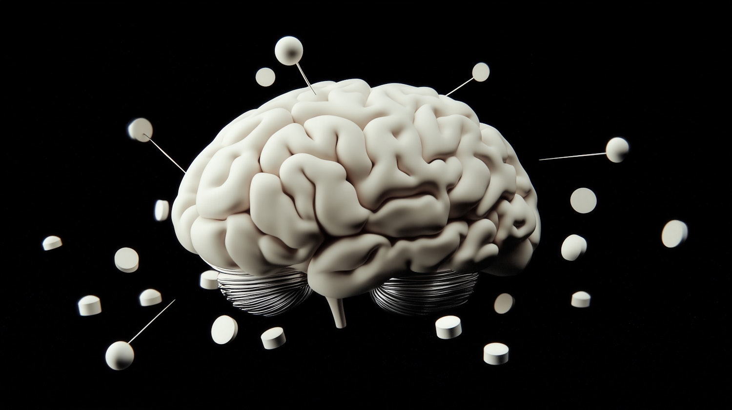 3D-rendered brain surrounded by floating pills and pins, symbolizing neuroscience, medication, and mental health concepts.