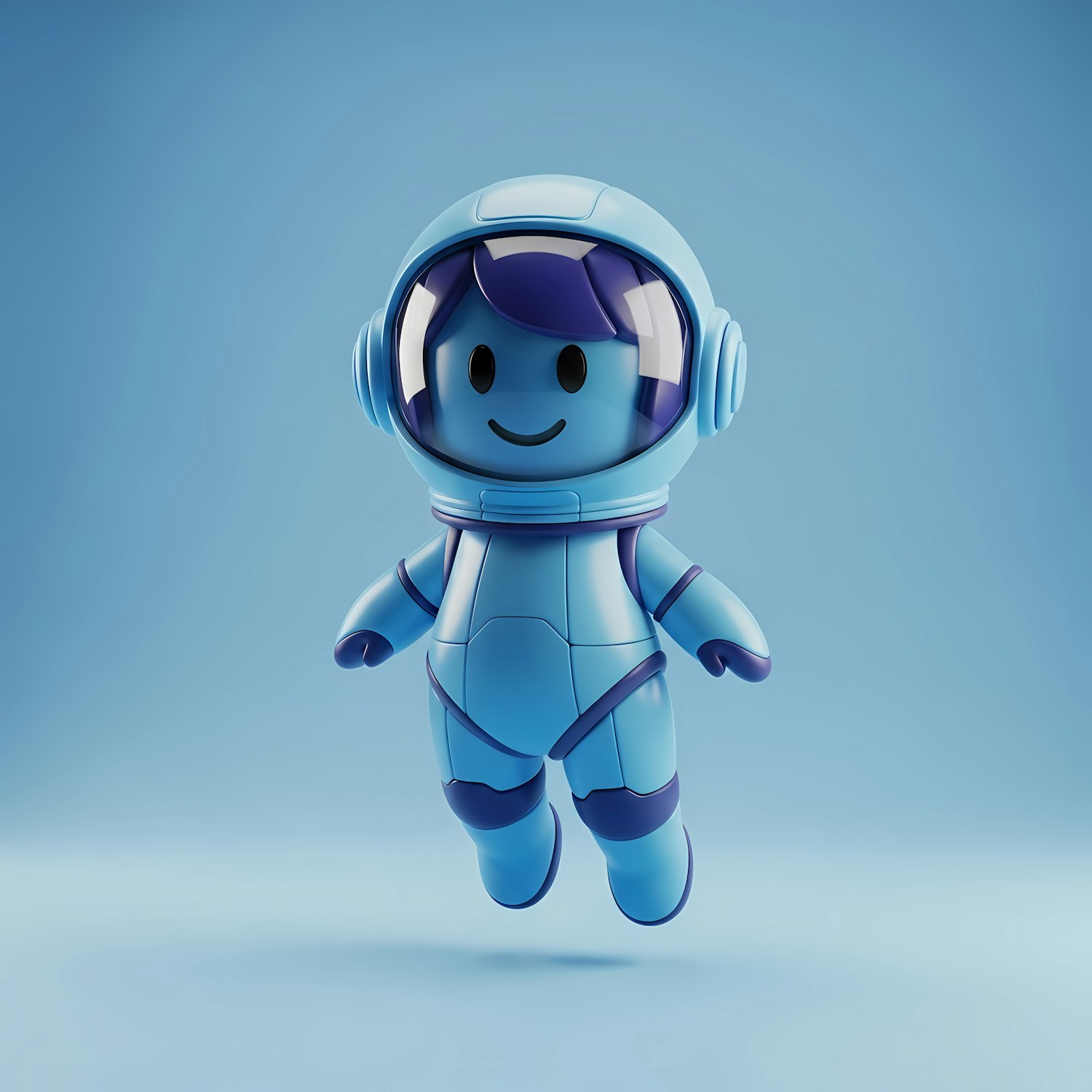 Adorable 3D astronaut character in a light blue spacesuit with a cheerful smile, set against a soft blue gradient background.