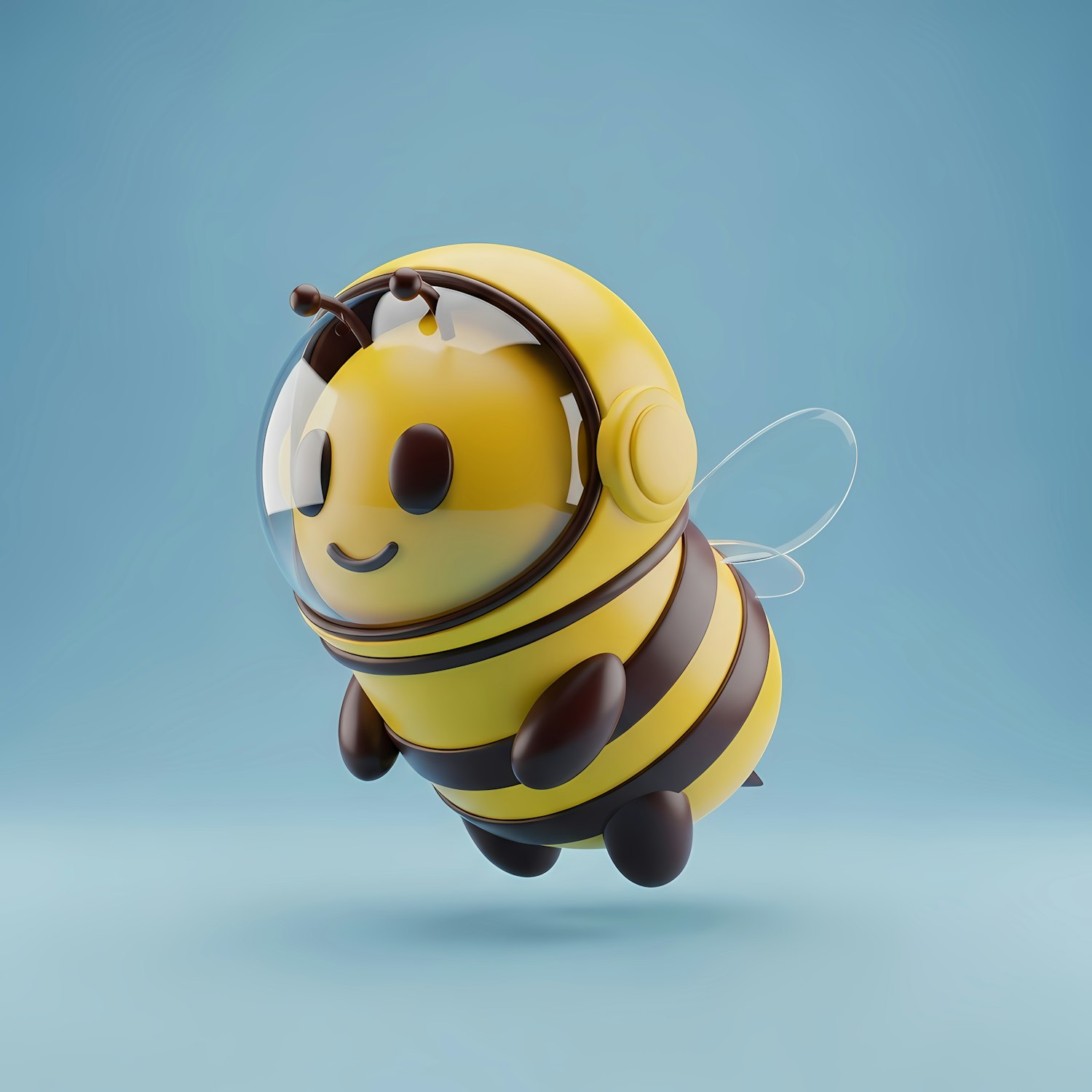 Adorable 3D cartoon bee with a helmet and wings, floating against a soft blue background. Perfect for cute and whimsical designs.