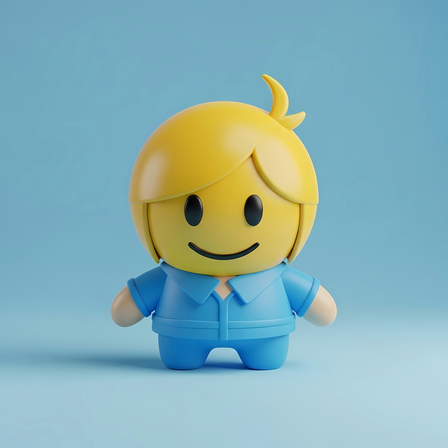 Adorable 3D cartoon character with yellow hair and a blue outfit, set against a clean light blue background.
