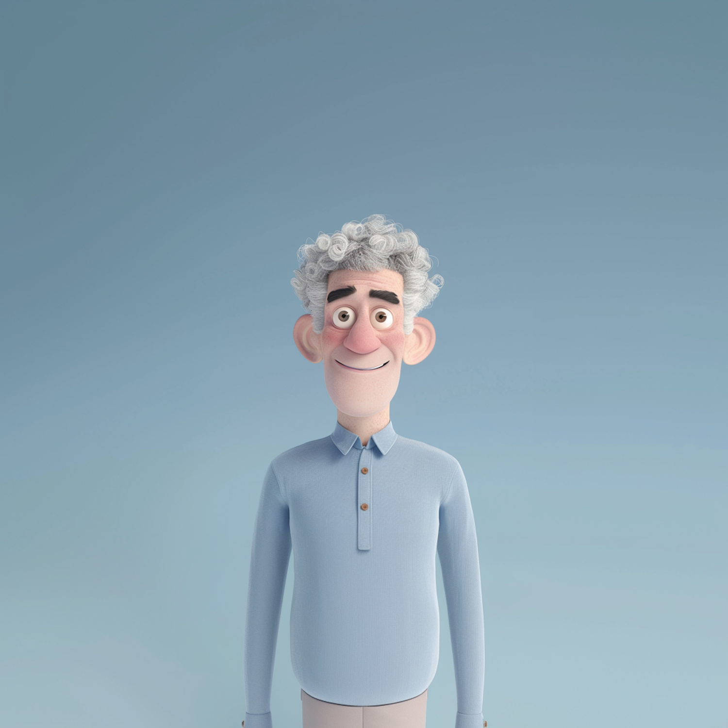 Charming 3D cartoon character with curly white hair and a light blue shirt, smiling warmly against a soft blue backdrop.
