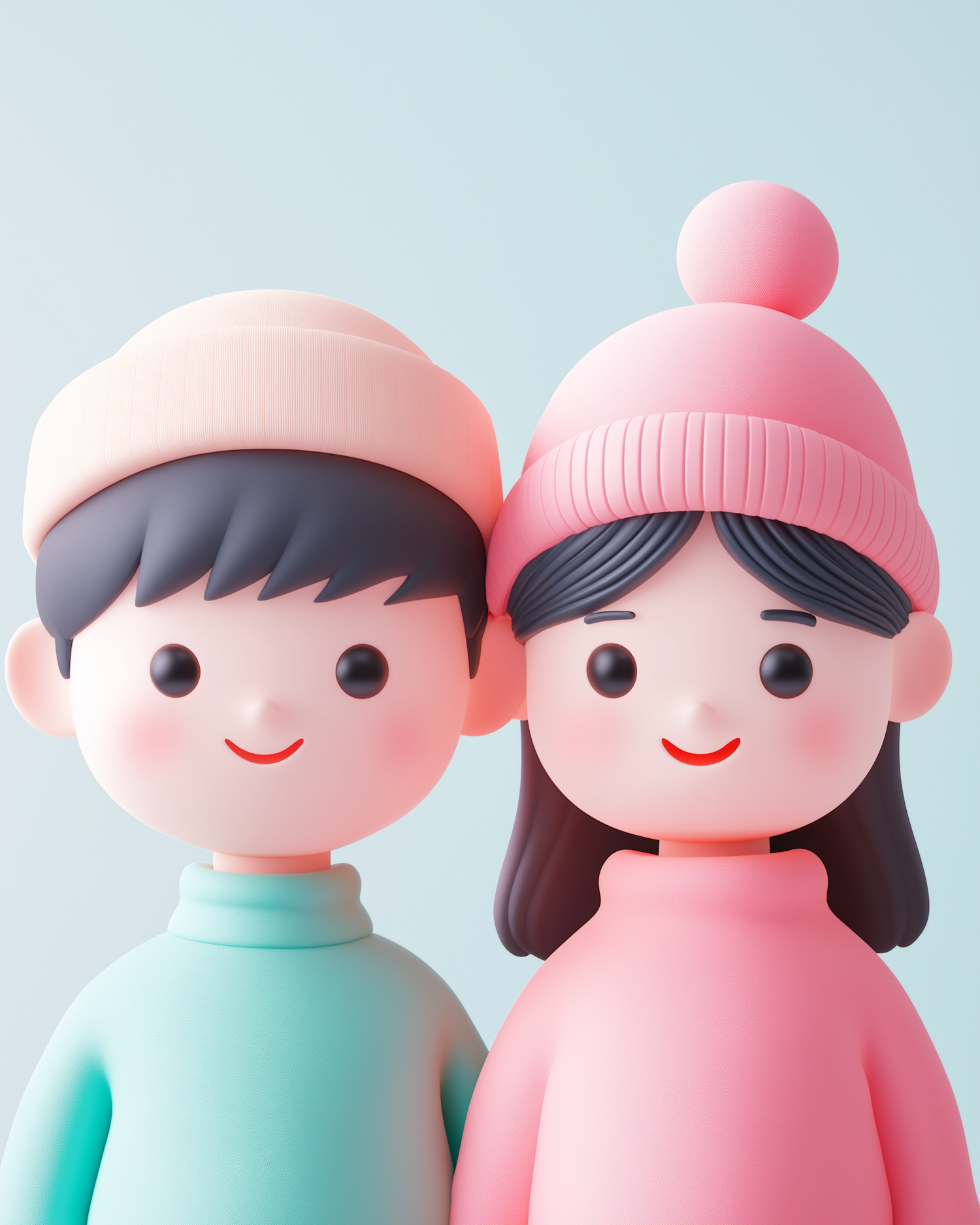 Adorable 3D cartoon boy and girl in pastel sweaters and beanies, smiling warmly against a soft blue background.