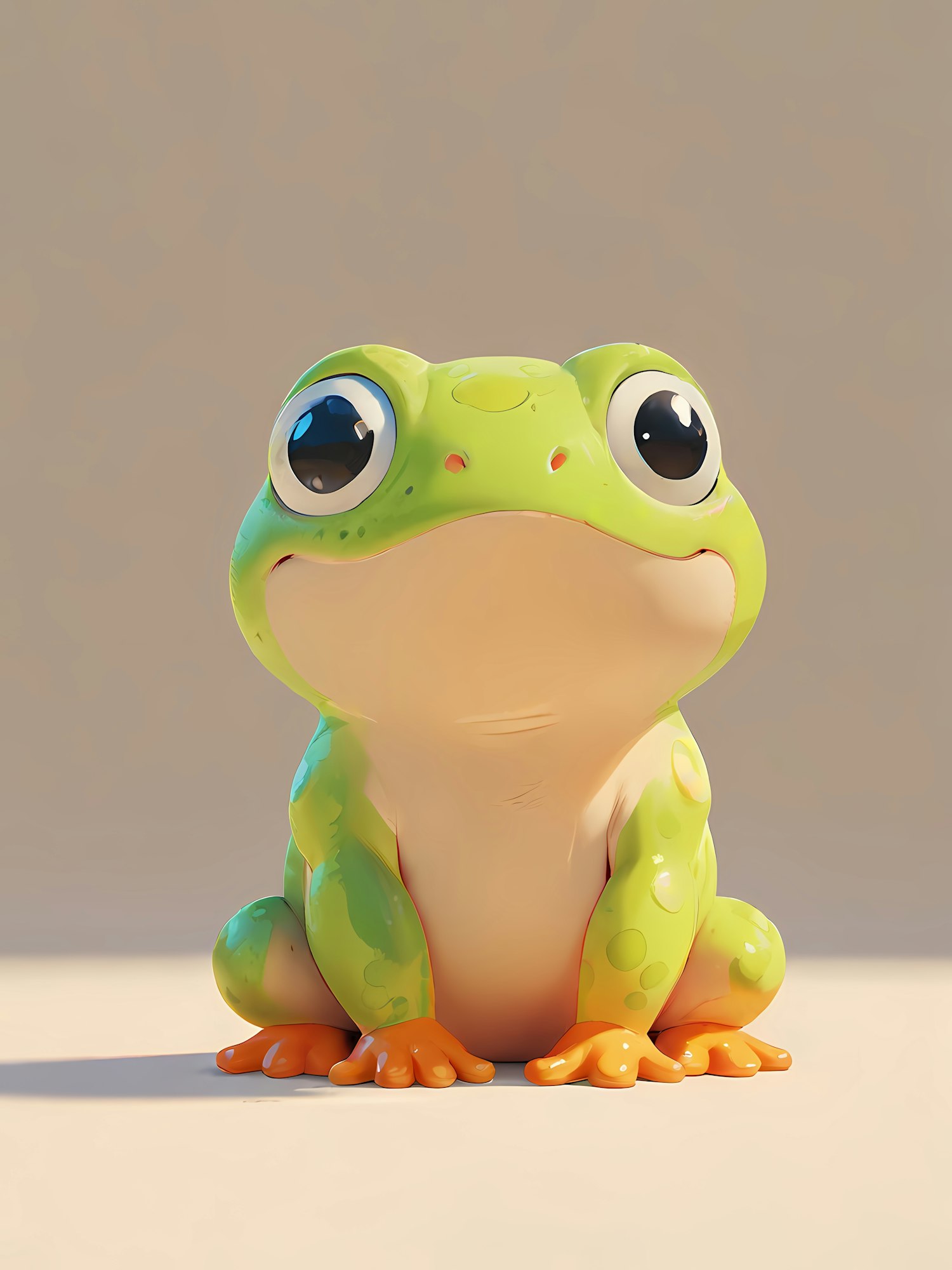 Adorable 3D-rendered frog with big eyes, green body, and orange toes on a neutral background. Perfect for playful and fun designs.
