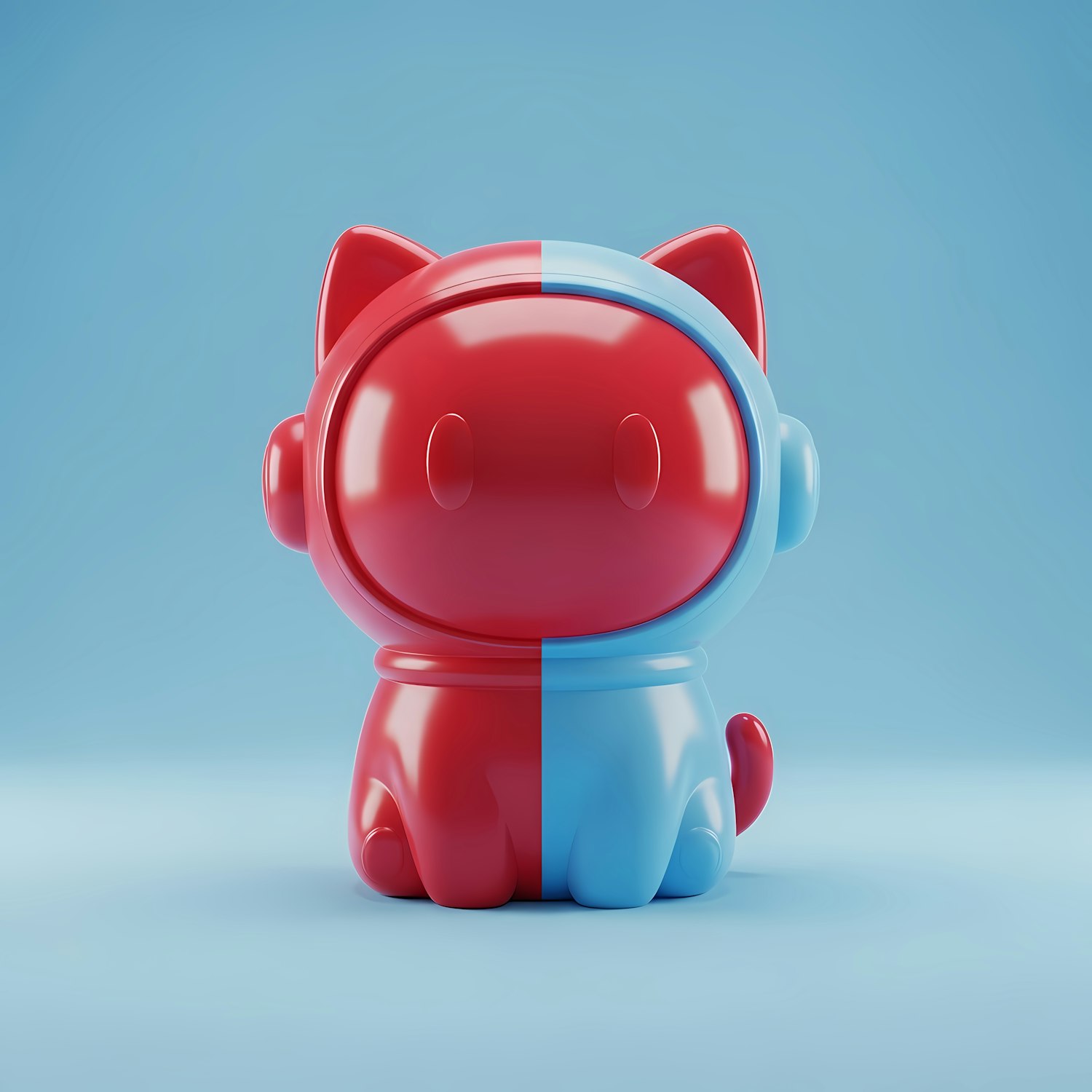 A glossy 3D cat figure split into red and blue halves, set against a light blue background. Minimalist and modern design.