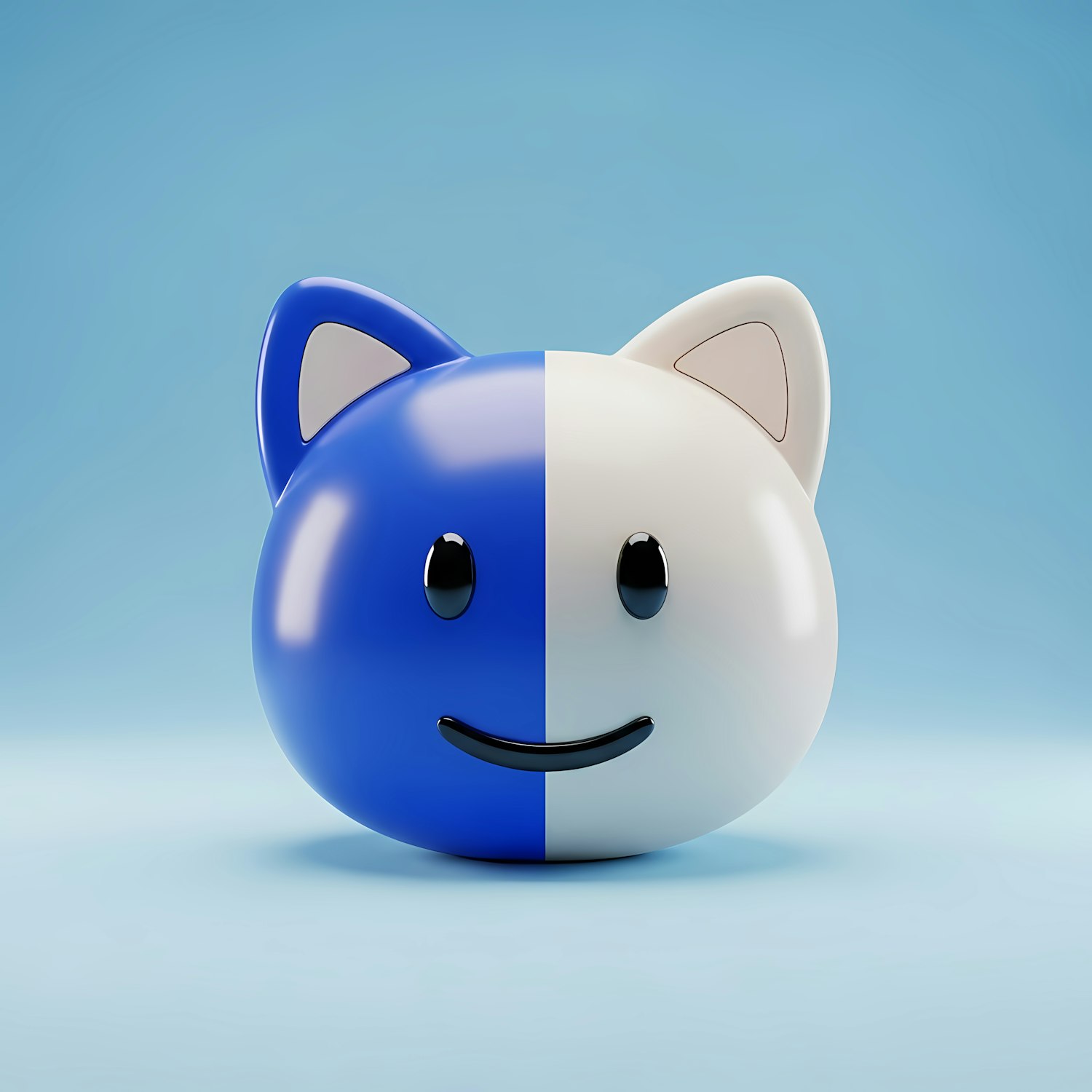 Cute 3D cat head design with a blue and white split color scheme, set against a light blue background. Perfect for playful designs.