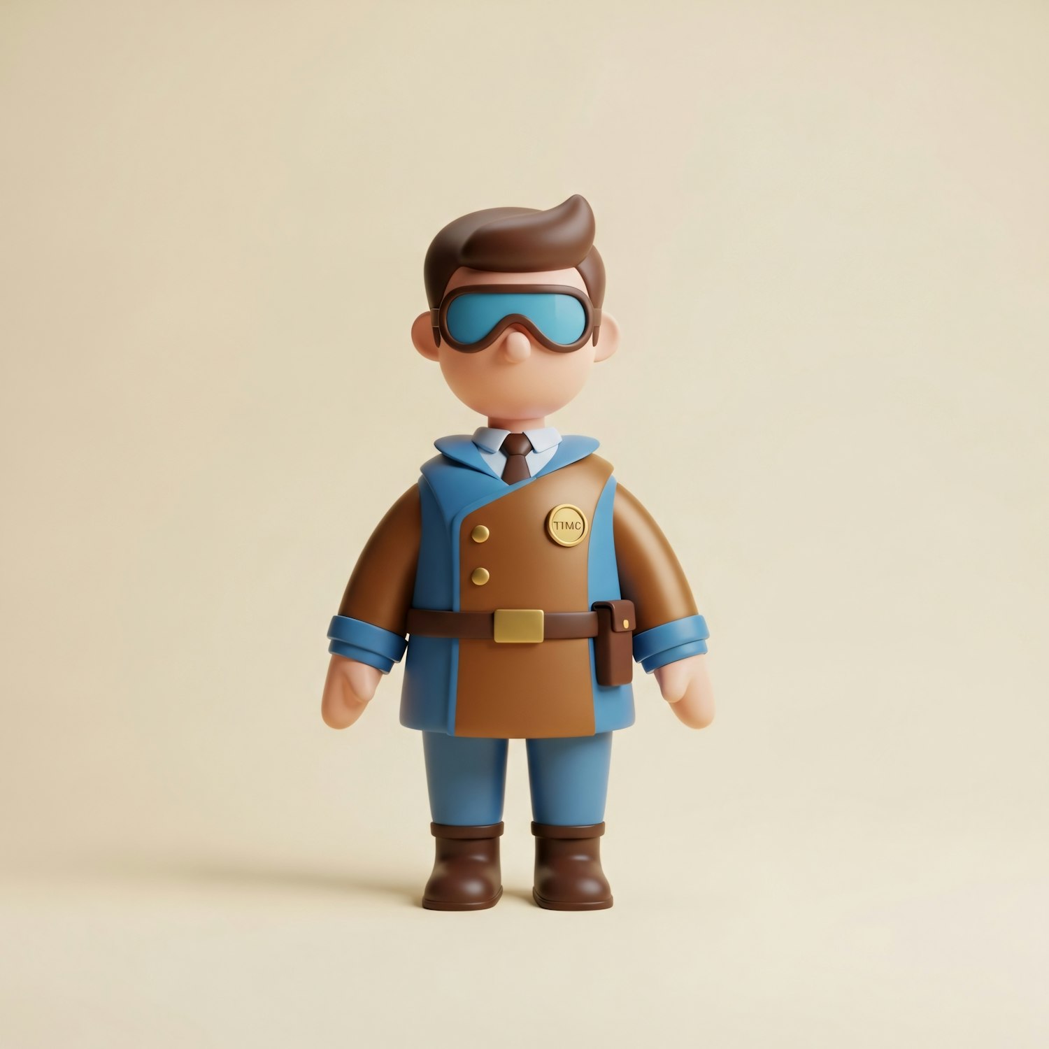A 3D character in a blue and brown uniform with a badge and belt, standing against a plain background.