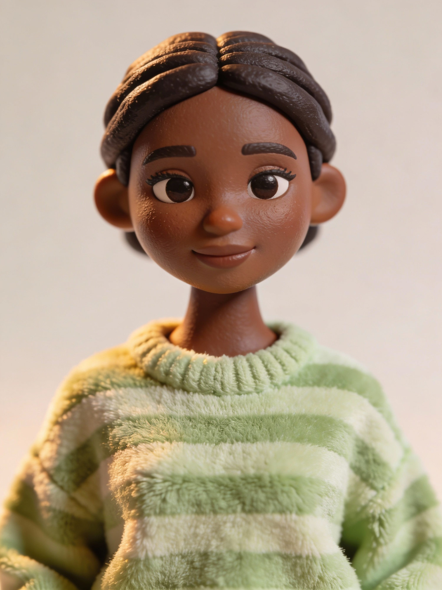 A 3D-rendered character with dark skin, styled hair, and a green striped sweater, showcasing a friendly and inviting expression.