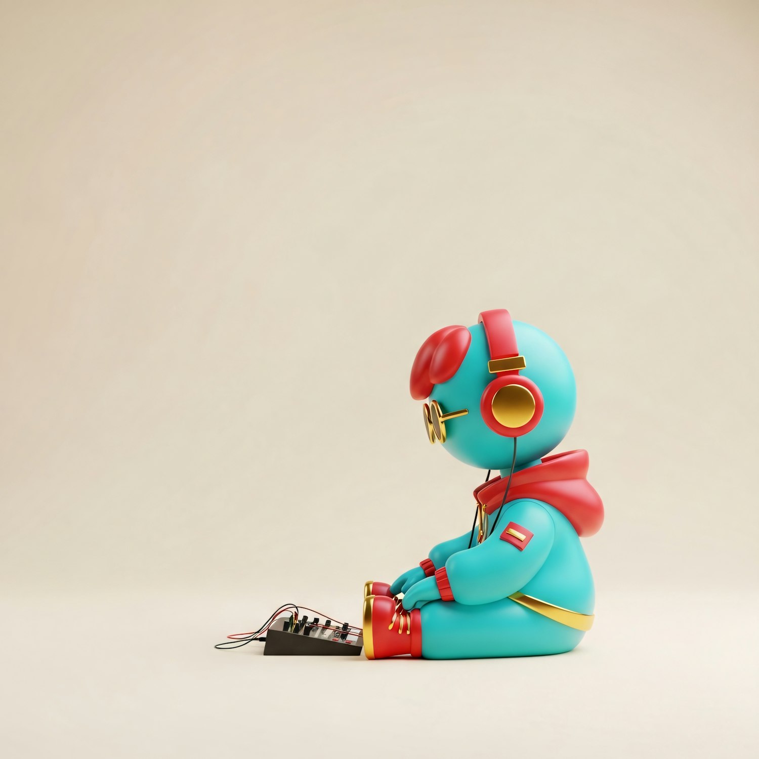A vibrant 3D character in red headphones and a hoodie interacts with a small electronic device, set against a neutral background.