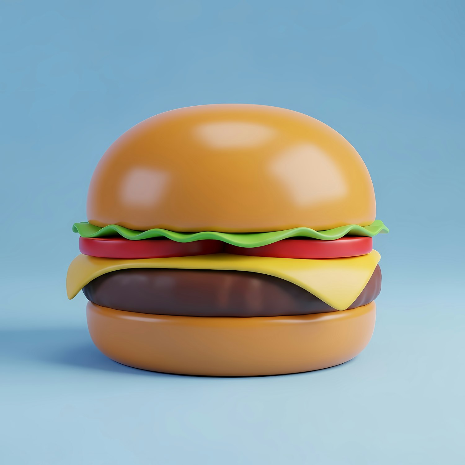 A vibrant 3D cheeseburger with lettuce, tomato, cheese, and a beef patty, set against a clean blue background.