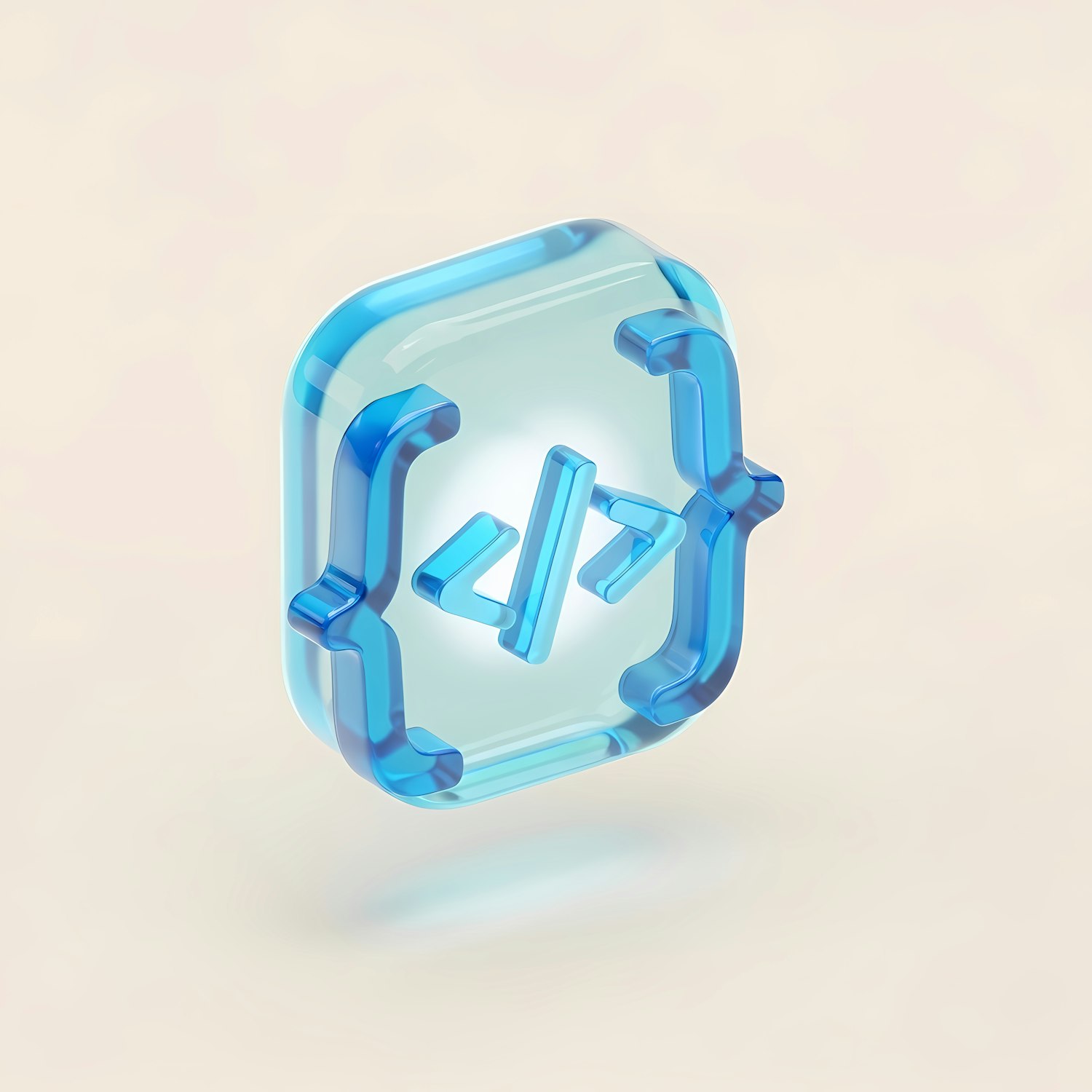 3D icon of a translucent blue coding symbol with curly braces and angle brackets, floating on a soft beige background.