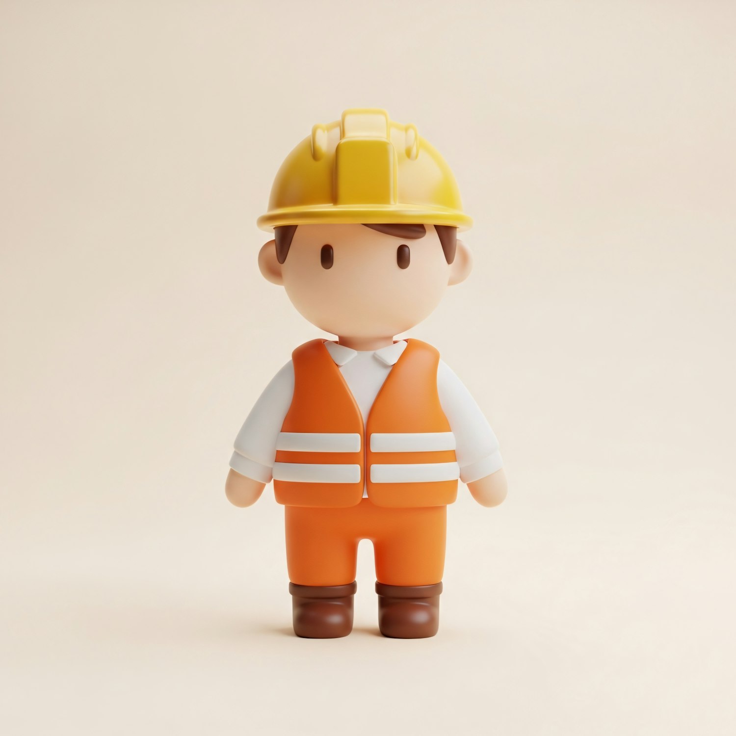 A cute 3D cartoon construction worker with a yellow hard hat and orange safety vest, standing against a plain beige background.