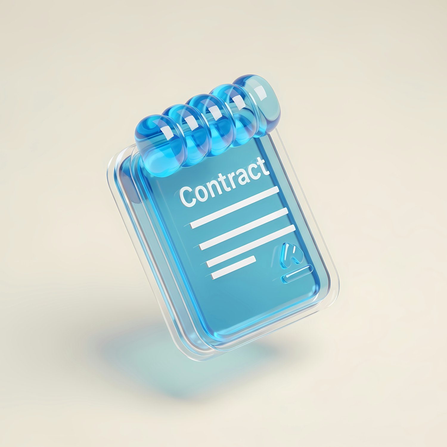 3D illustration of a translucent blue contract document with spiral binding, floating on a light background. Modern and minimalistic design.