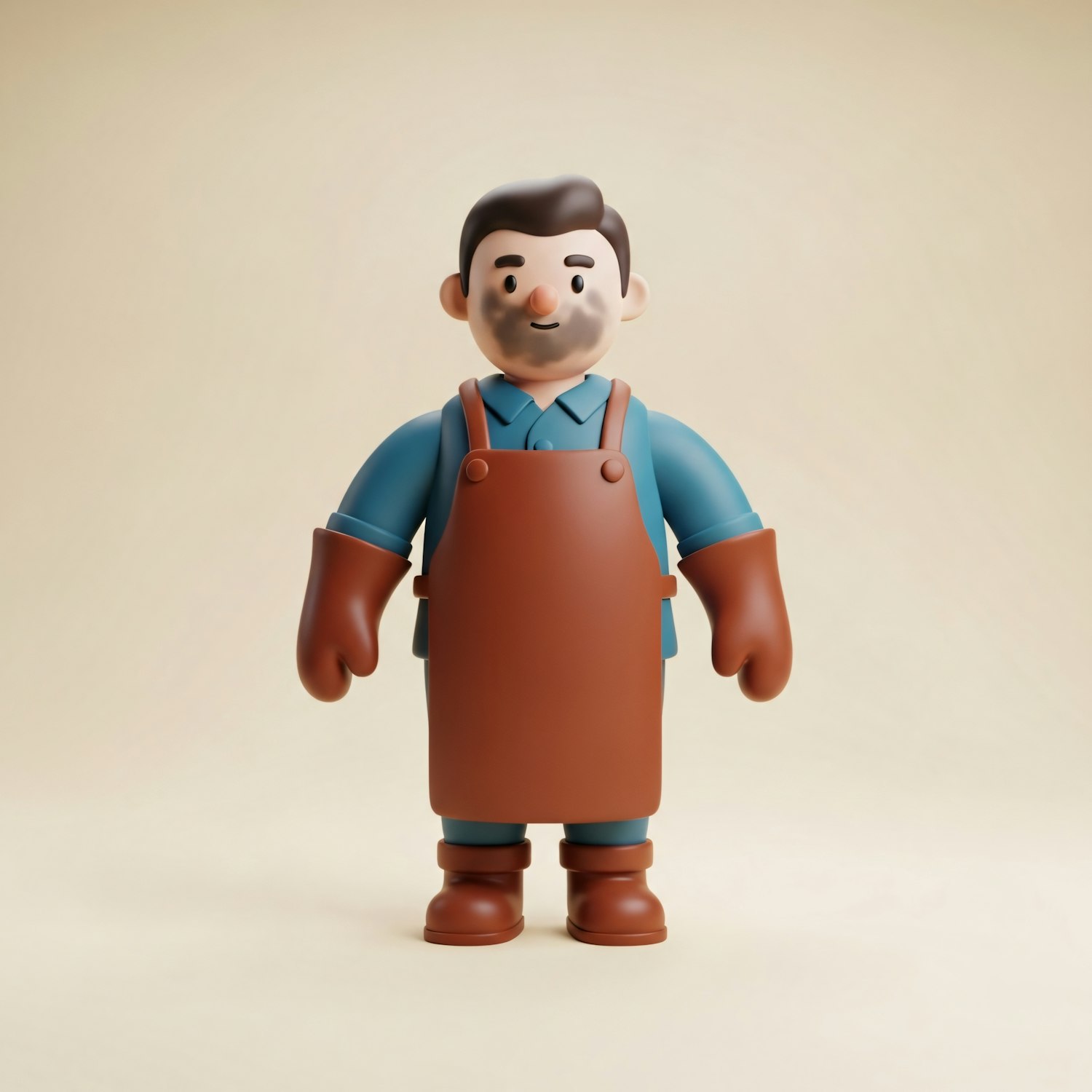 A 3D-rendered cartoon character in a brown apron and gloves, standing against a neutral background, showcasing a craftsman theme.