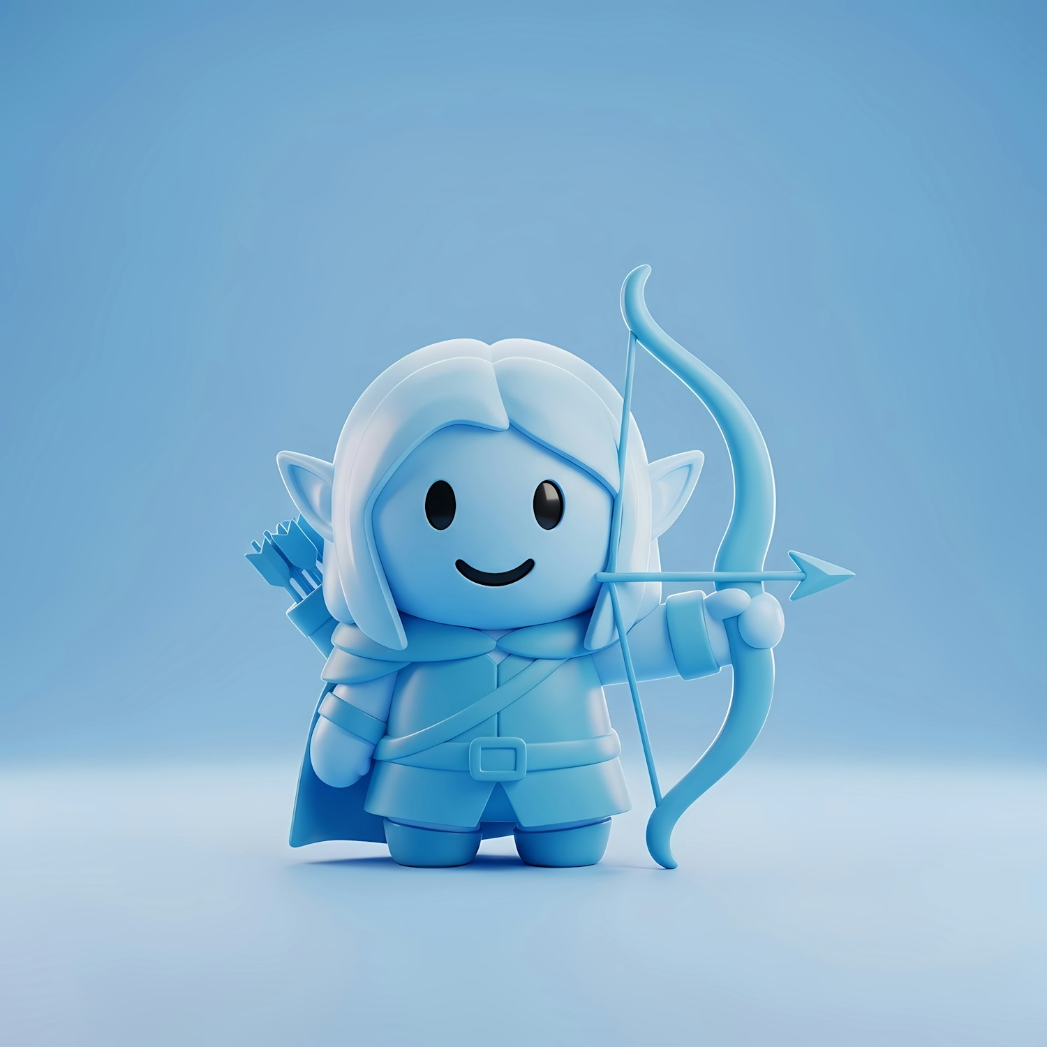 Adorable 3D elf character in blue, holding a bow and arrow, with a cheerful expression and a minimalist background.