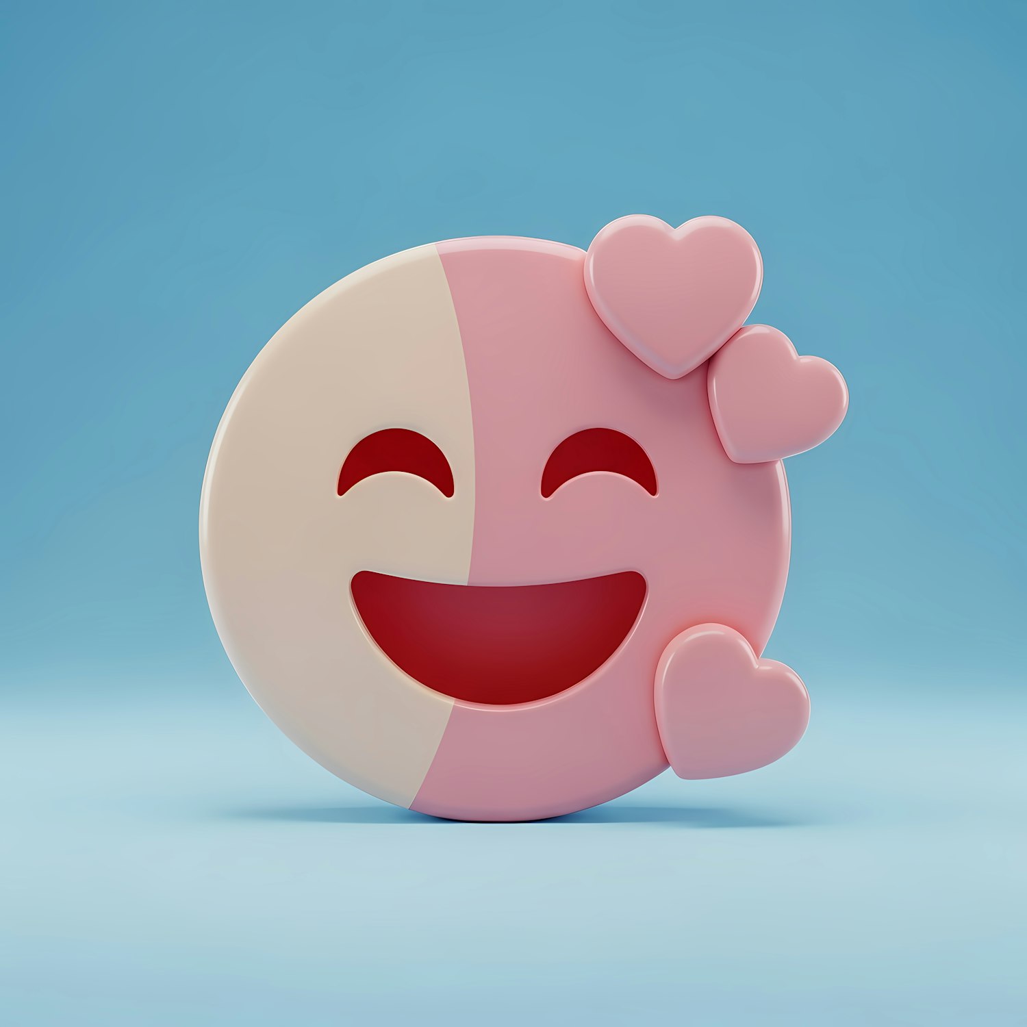 Cute 3D emoji with a pink and cream design, smiling with hearts on the side, set against a soft blue background.