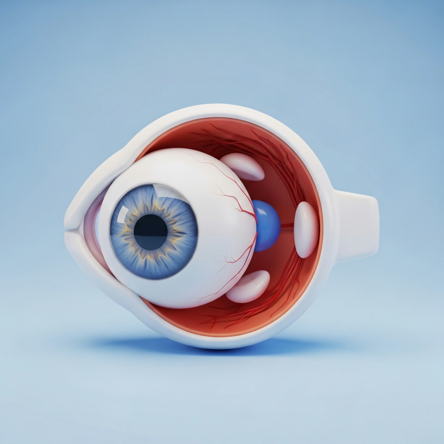 A detailed 3D model of a human eye cross-section, highlighting the anatomy with a blue iris and realistic textures on a light blue background.