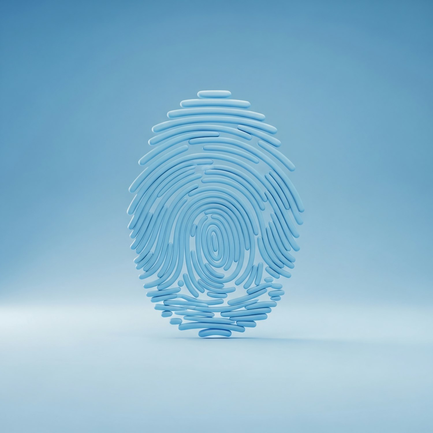 A 3D-rendered blue fingerprint design on a gradient blue background, showcasing a modern and minimalistic aesthetic.
