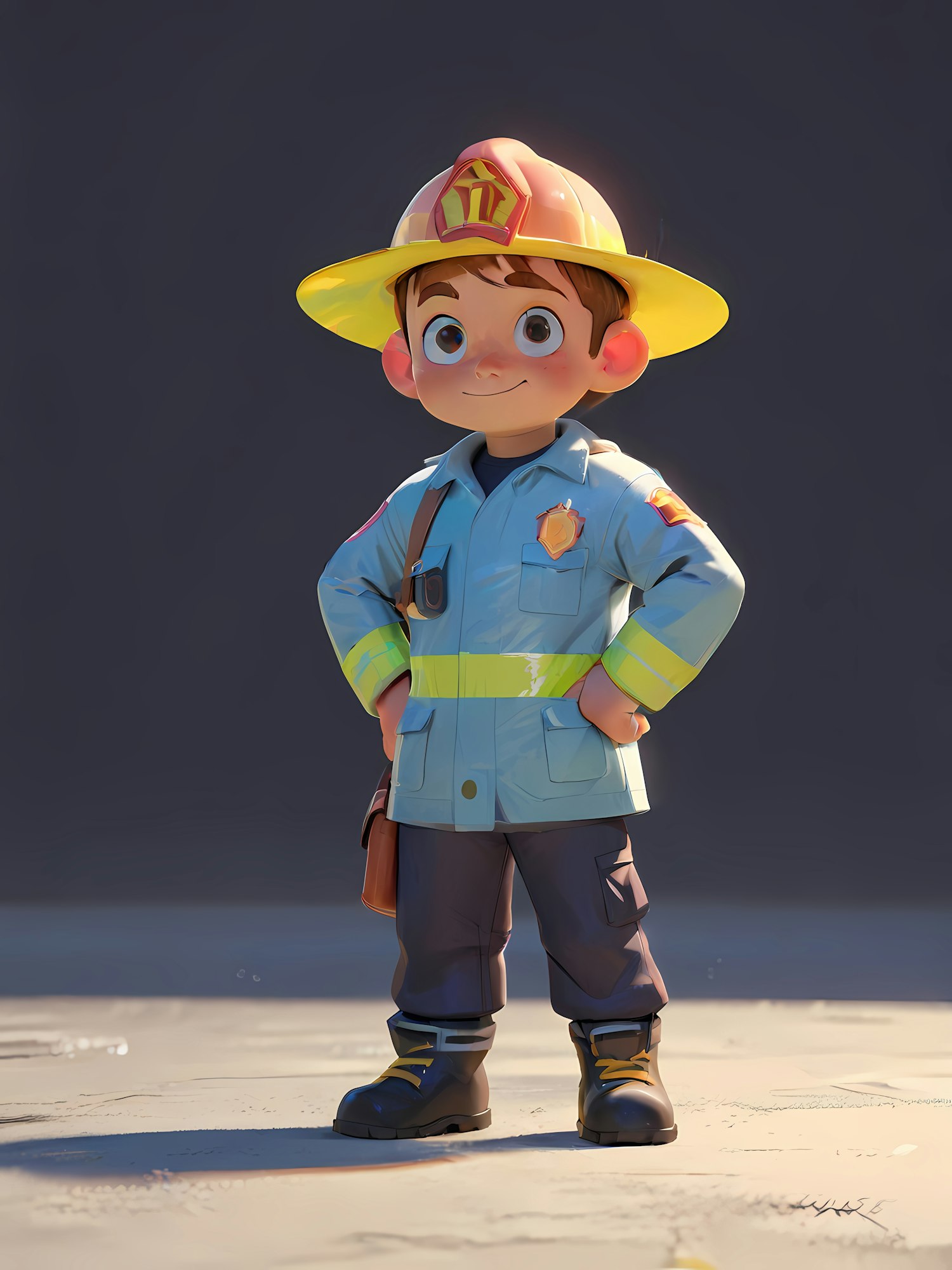 Adorable 3D illustration of a young boy in a firefighter outfit, complete with a yellow helmet and reflective jacket.