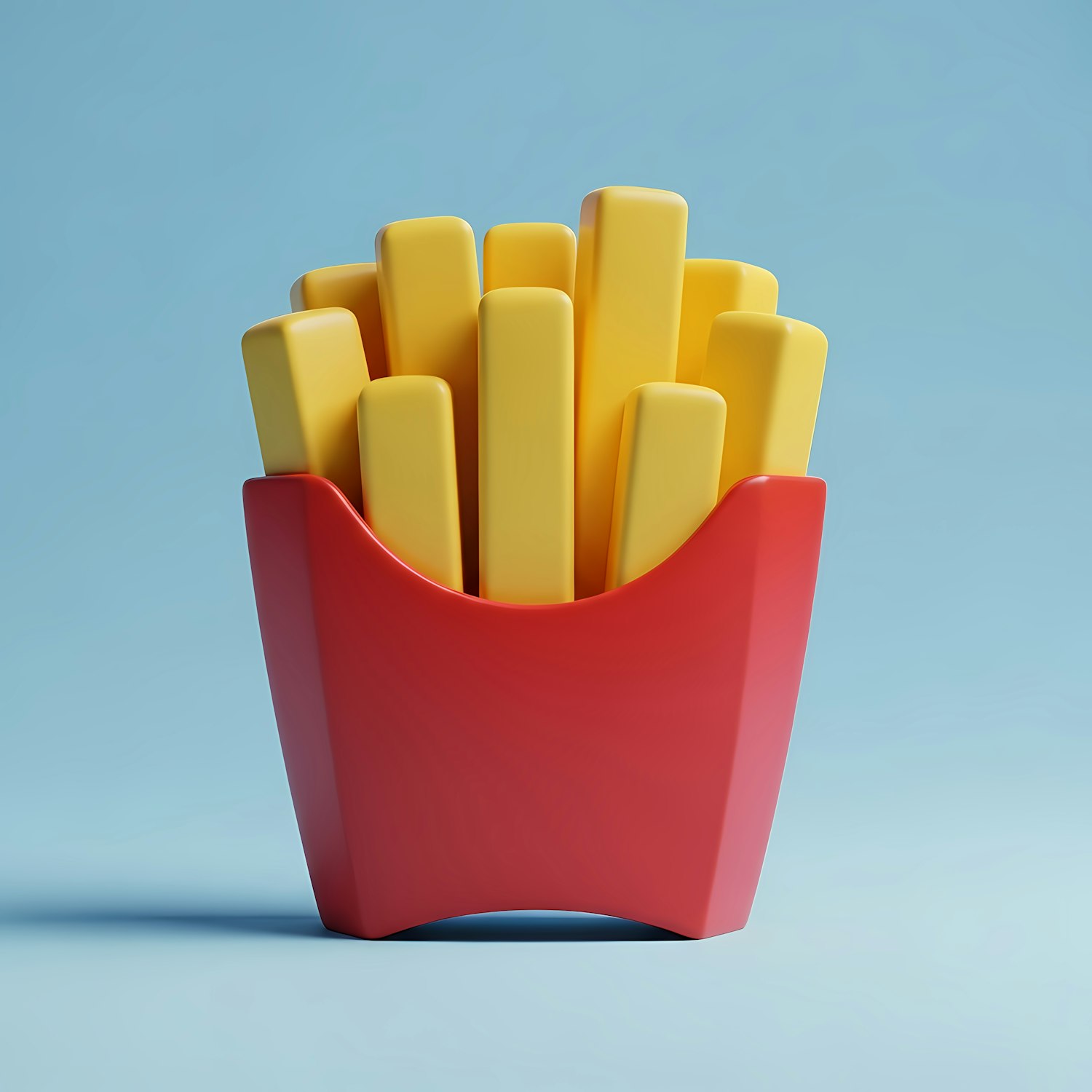 A vibrant 3D illustration of a red container filled with yellow, blocky fries against a light blue backdrop.