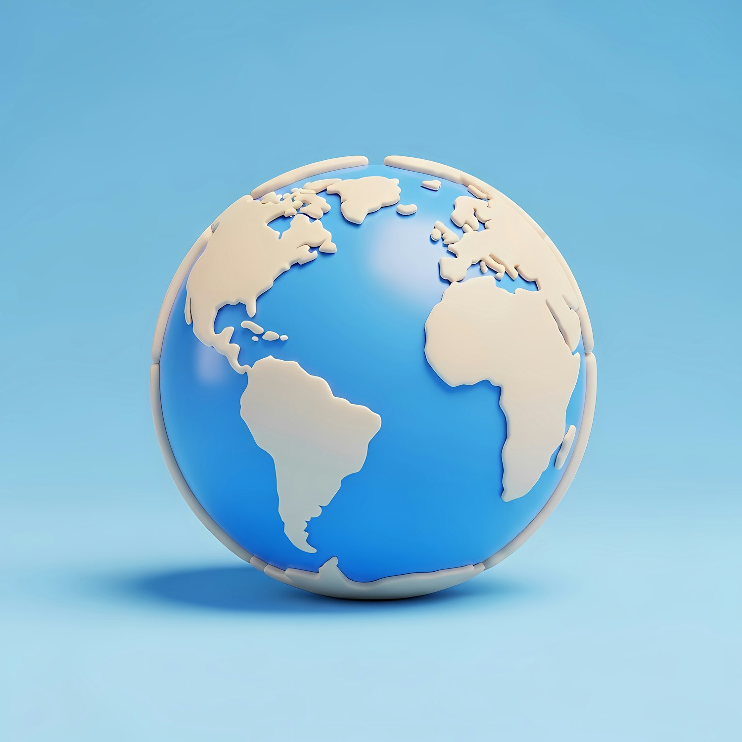 3D-rendered globe with blue oceans and beige continents, highlighting the Americas, Europe, and Africa on a light blue background.