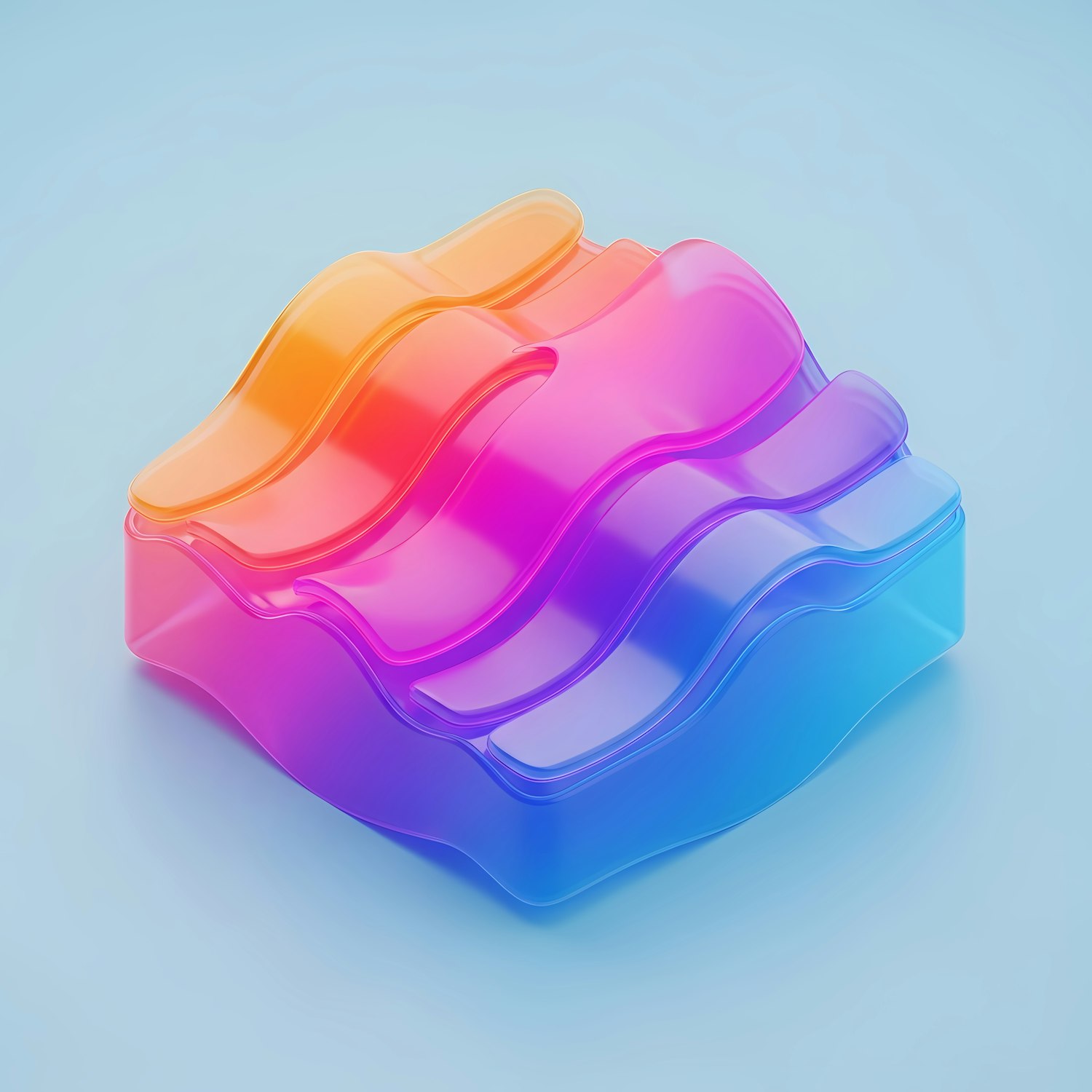 Vibrant 3D abstract design with wavy, translucent layers in gradient colors from orange to blue on a soft blue background.