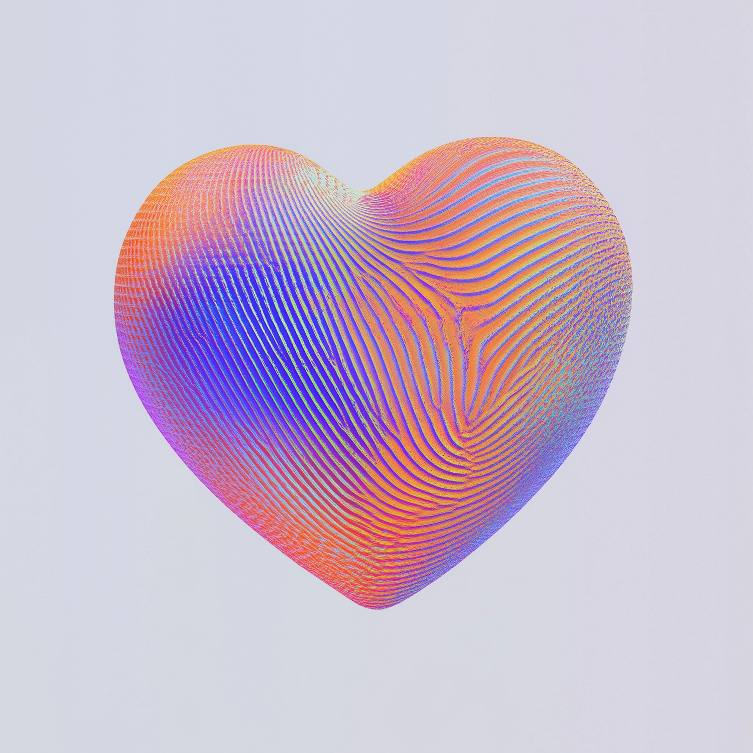 A colorful 3D heart with wavy textures and a gradient of orange, pink, purple, and blue on a light gray background.