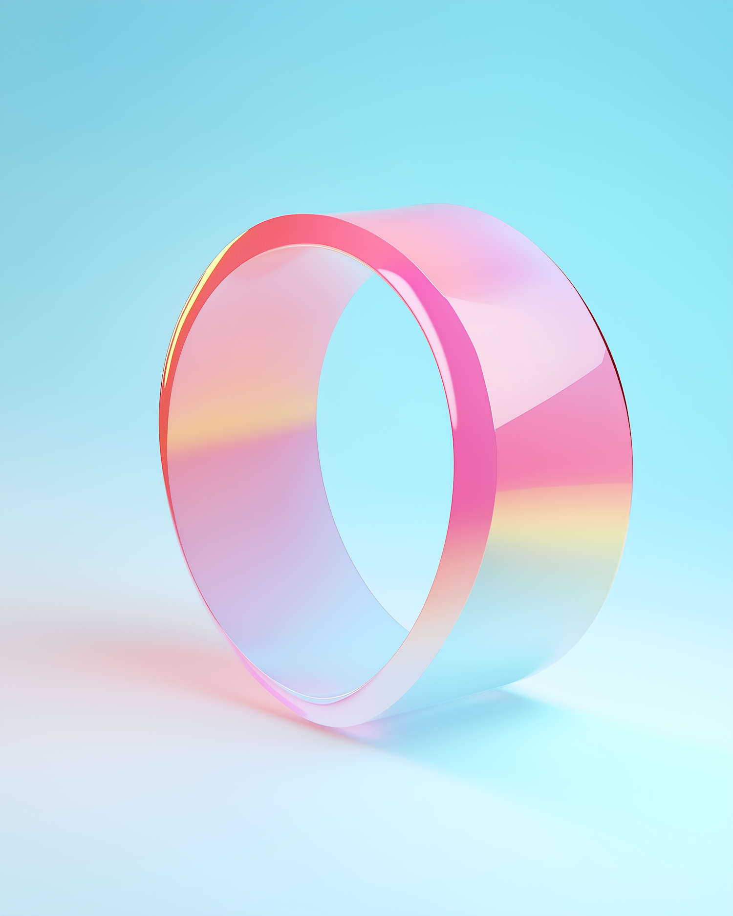 A glossy, translucent 3D ring with pink, yellow, and blue hues on a soft gradient background, creating a dreamy and modern aesthetic.