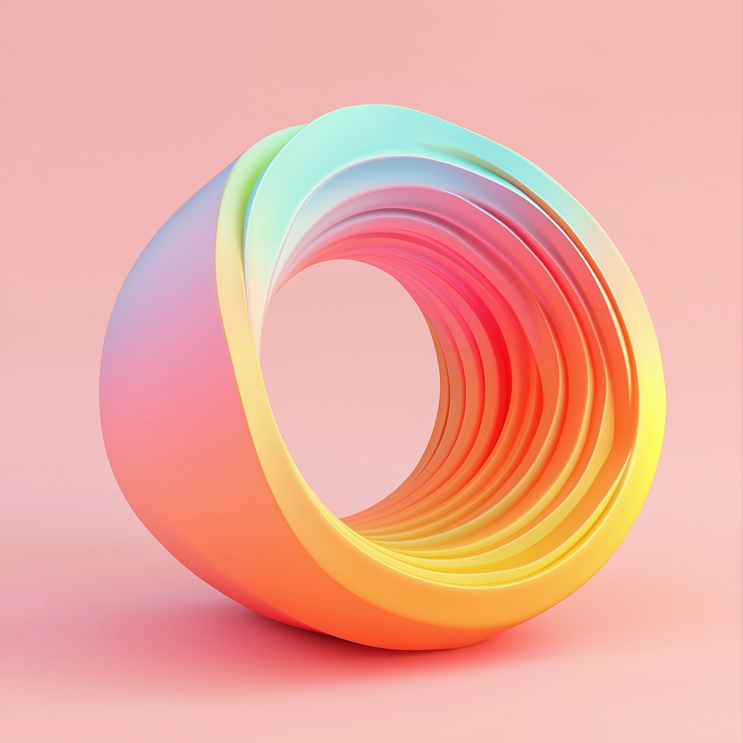 A colorful 3D abstract sculpture with layered ribbons in gradient hues, set against a soft peach background. Modern and eye-catching design.