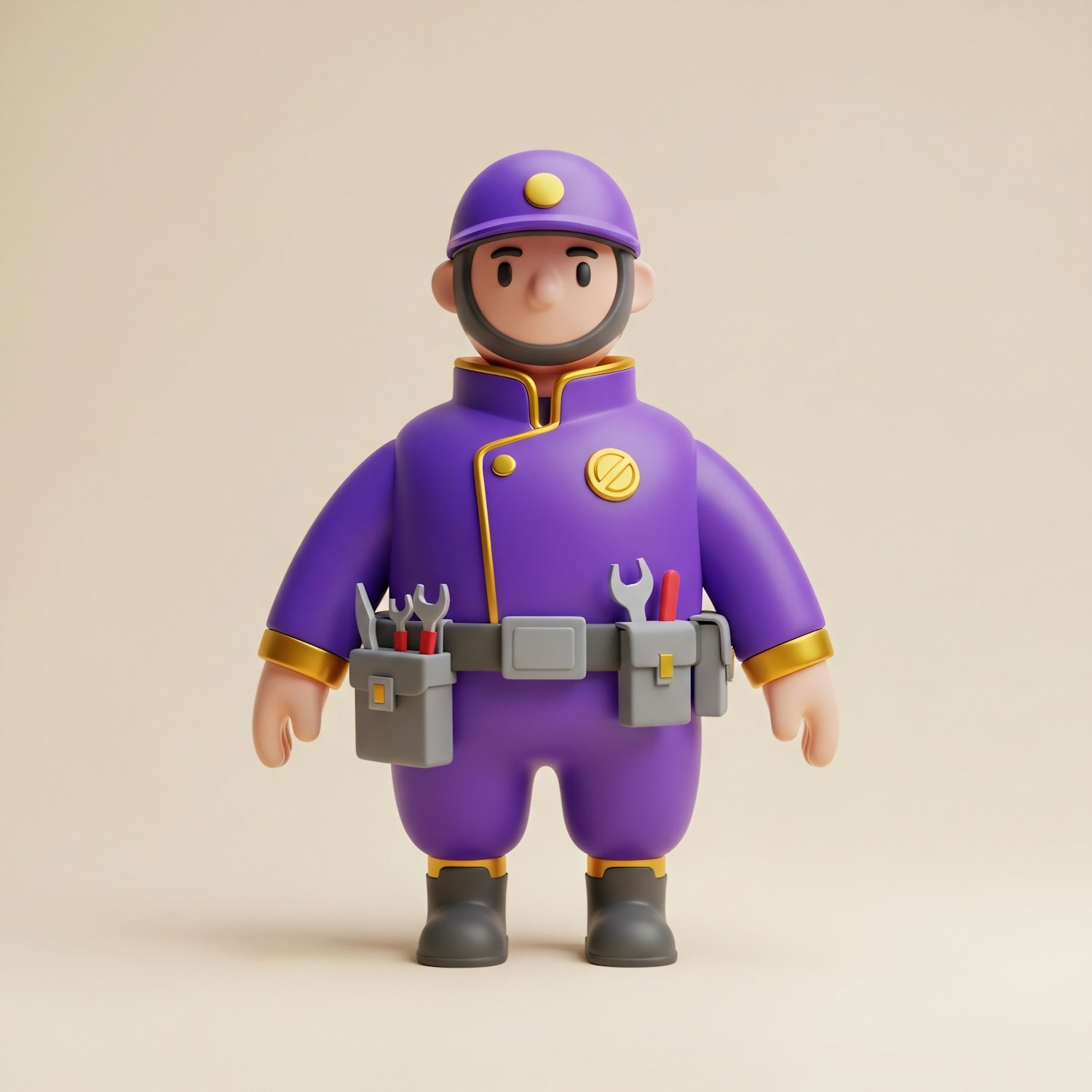 A 3D-rendered cartoon character in a purple uniform with tools, showcasing a playful and professional design.
