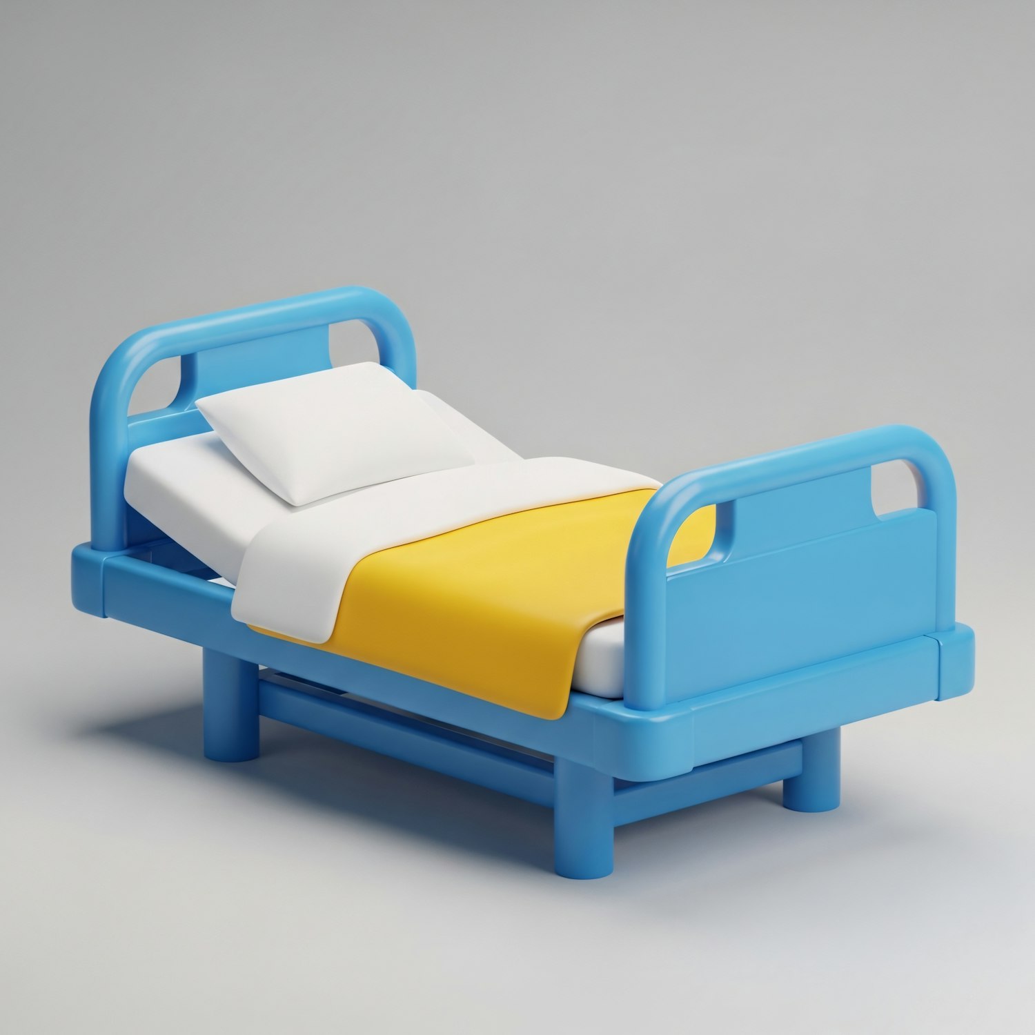 A 3D-rendered hospital bed with a blue frame, white mattress, and yellow blanket, showcasing a clean and minimalistic design.
