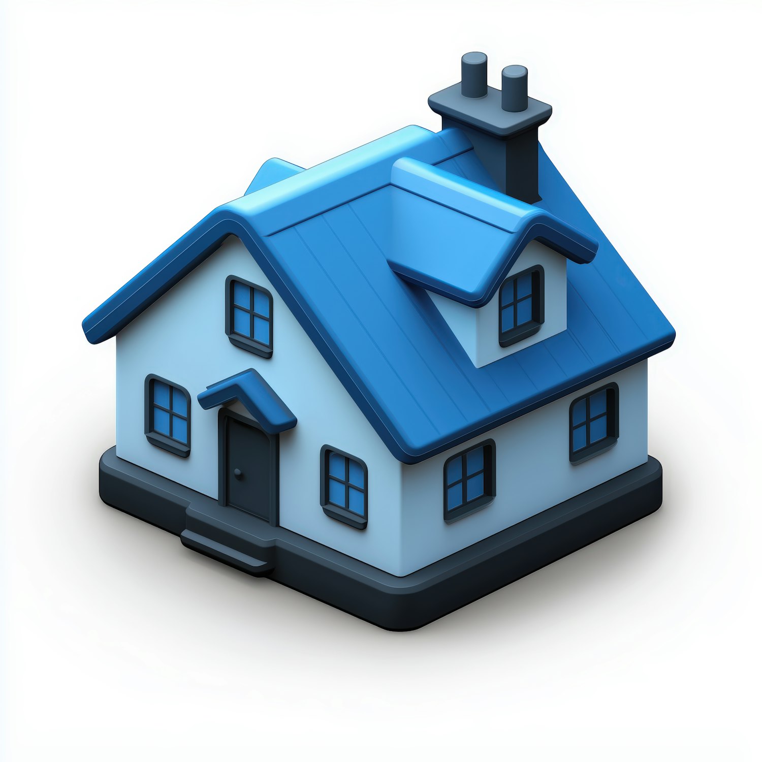 Charming 3D illustration of a small house with a blue roof, white walls, and cozy details like a dormer window and chimneys.
