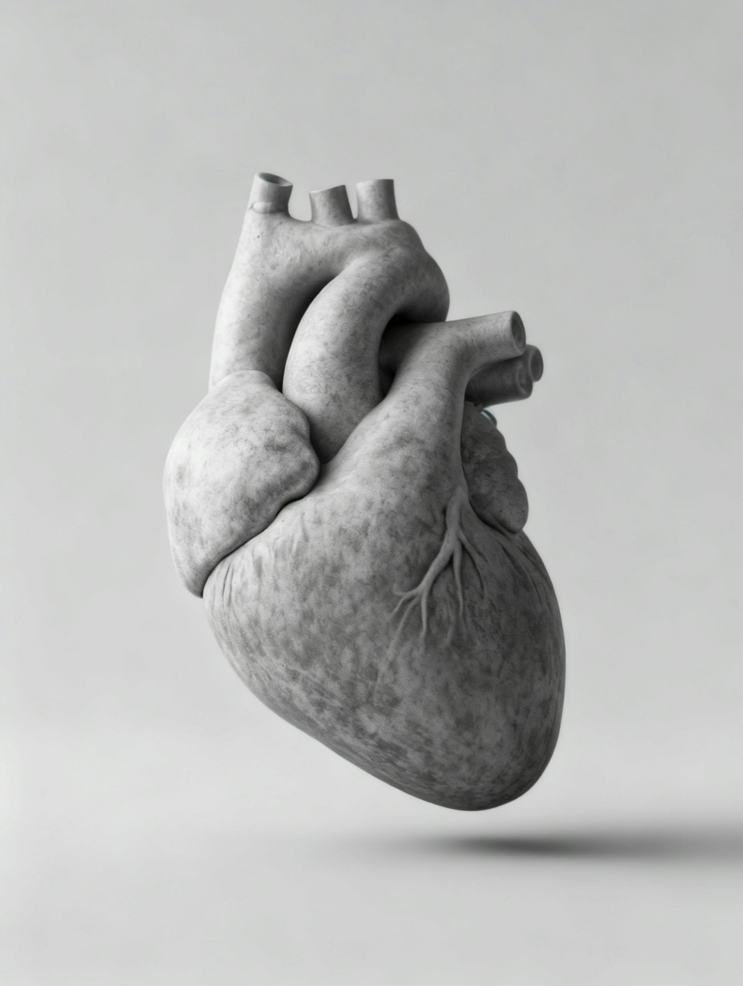 Realistic 3D rendering of a human heart in grayscale, showcasing detailed anatomy and texture against a neutral background.