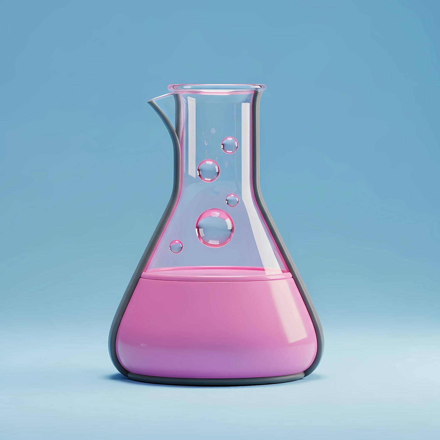 A 3D-rendered laboratory flask with pink liquid and bubbles, set against a clean blue background. Perfect for science-themed visuals.