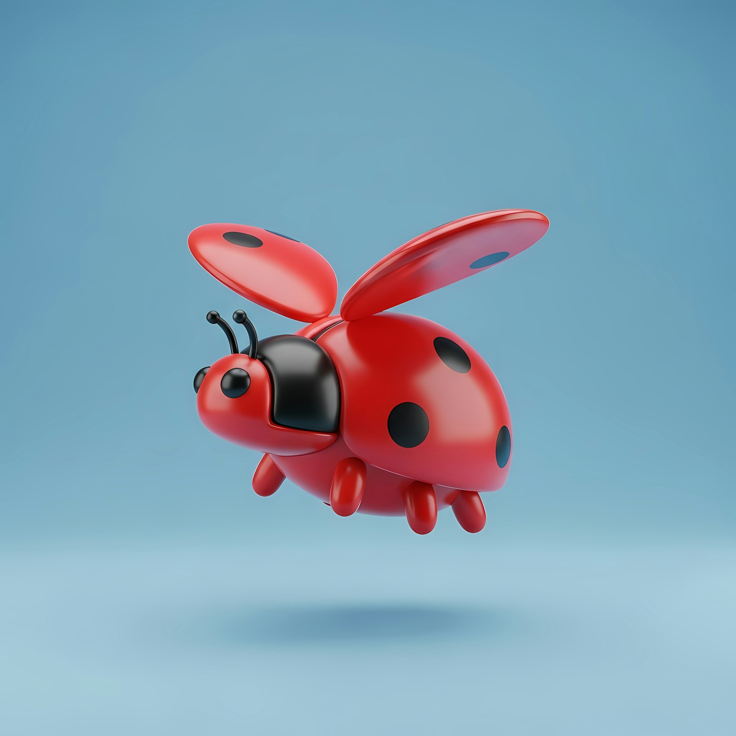 A 3D-rendered ladybug with a glossy red body and black spots, mid-flight against a soft blue background, showcasing vibrant and playful design.