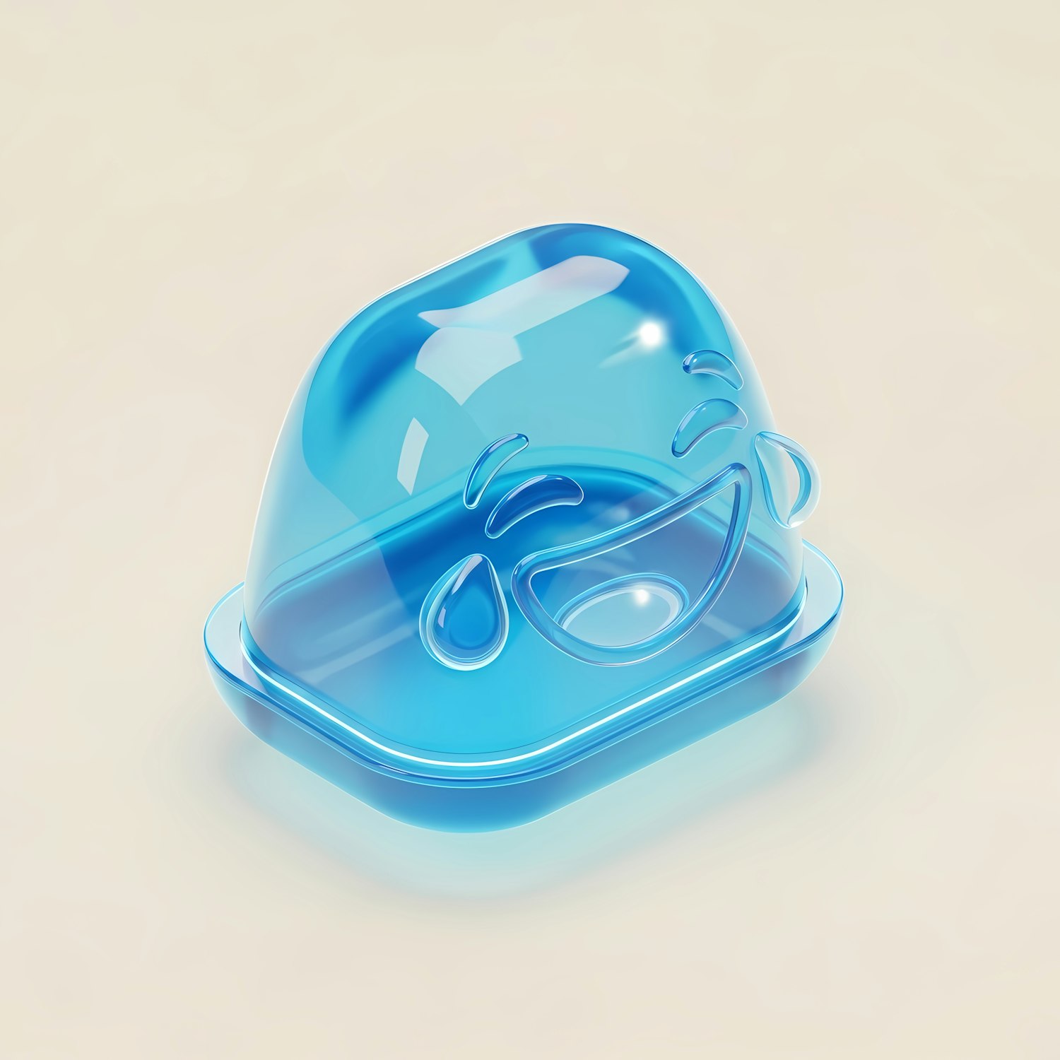 A glossy 3D blue emoji with a laughing face and tears of joy, set against a soft beige background. Fun and modern design.