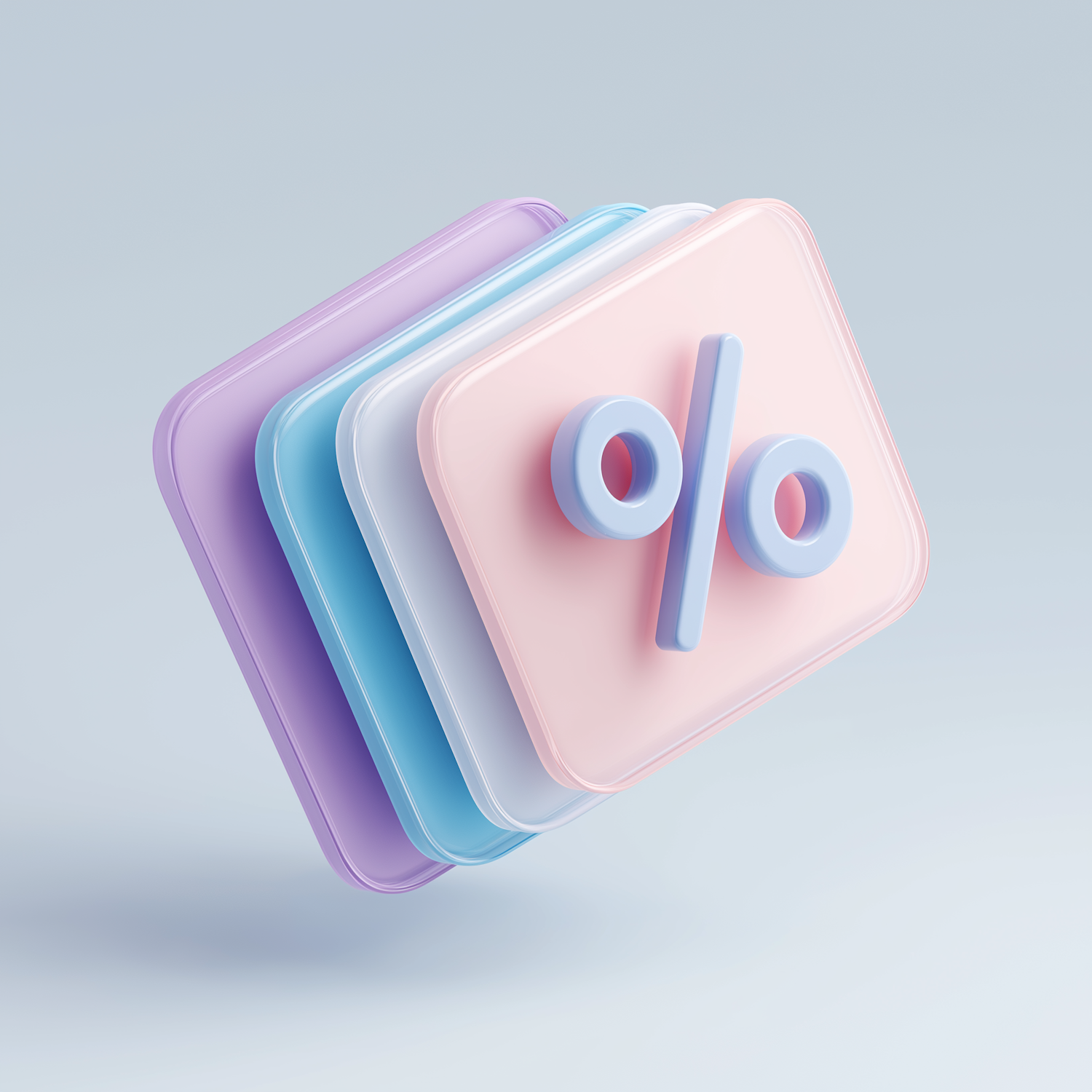 3D-rendered pastel squares with a blue percent symbol on a pink panel, floating against a light blue background.