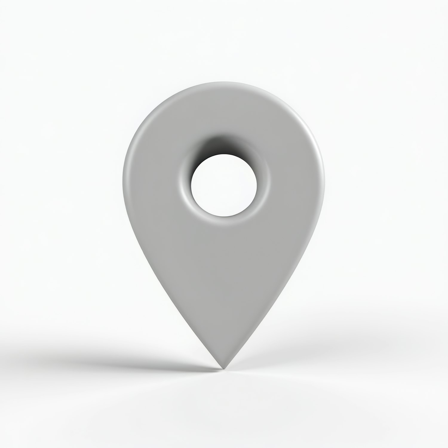 Minimalist 3D location pin icon in light gray with a circular hole, set against a plain white background.