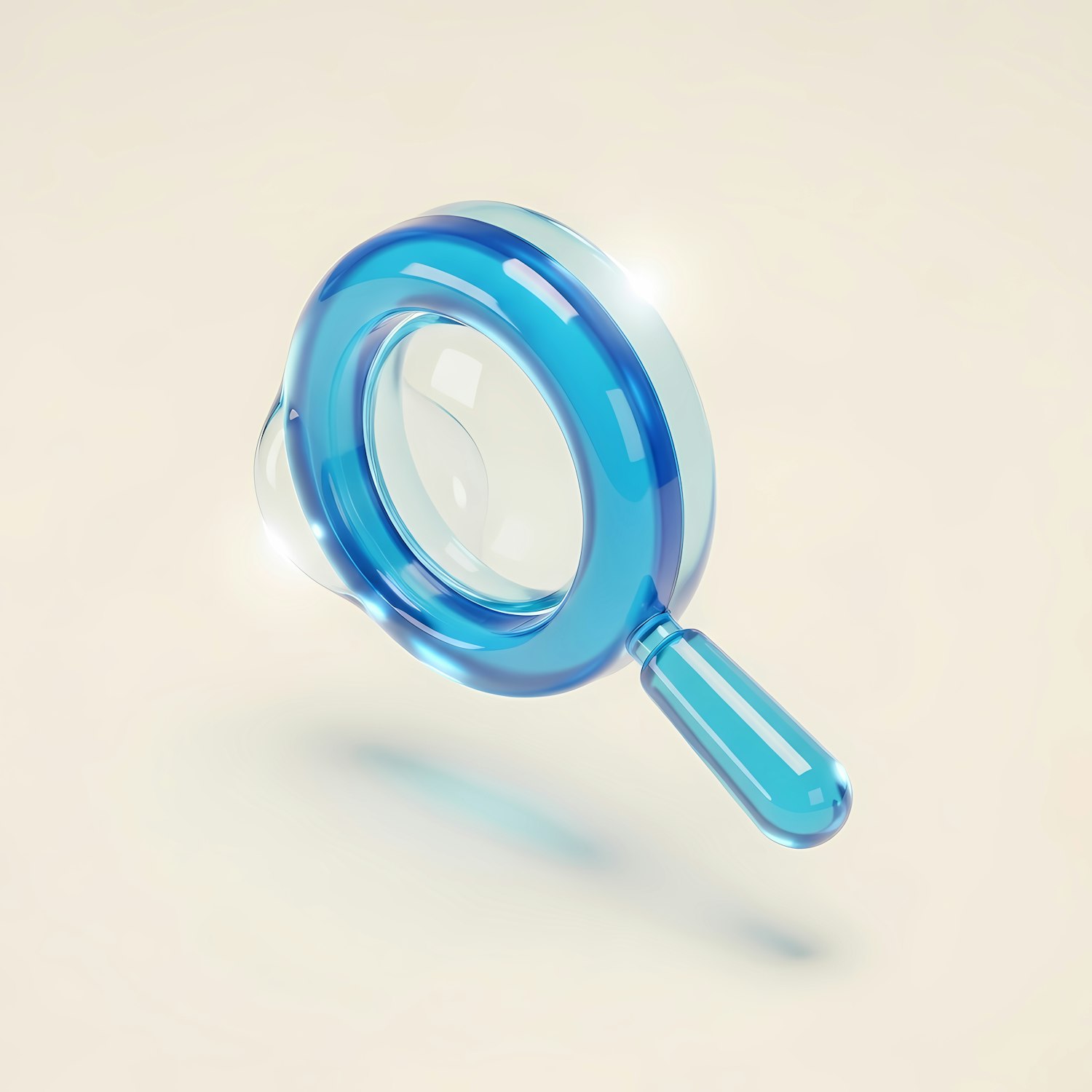 3D-rendered magnifying glass with a glossy blue frame, floating against a soft beige background. Sleek and modern design.