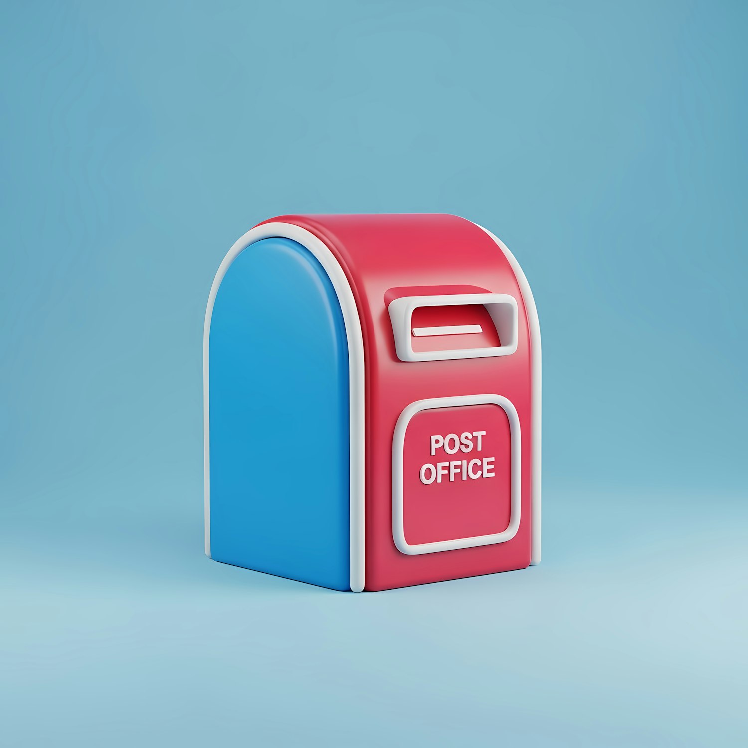 A vibrant 3D mailbox with red and blue colors, labeled 'Post Office', on a light blue background.