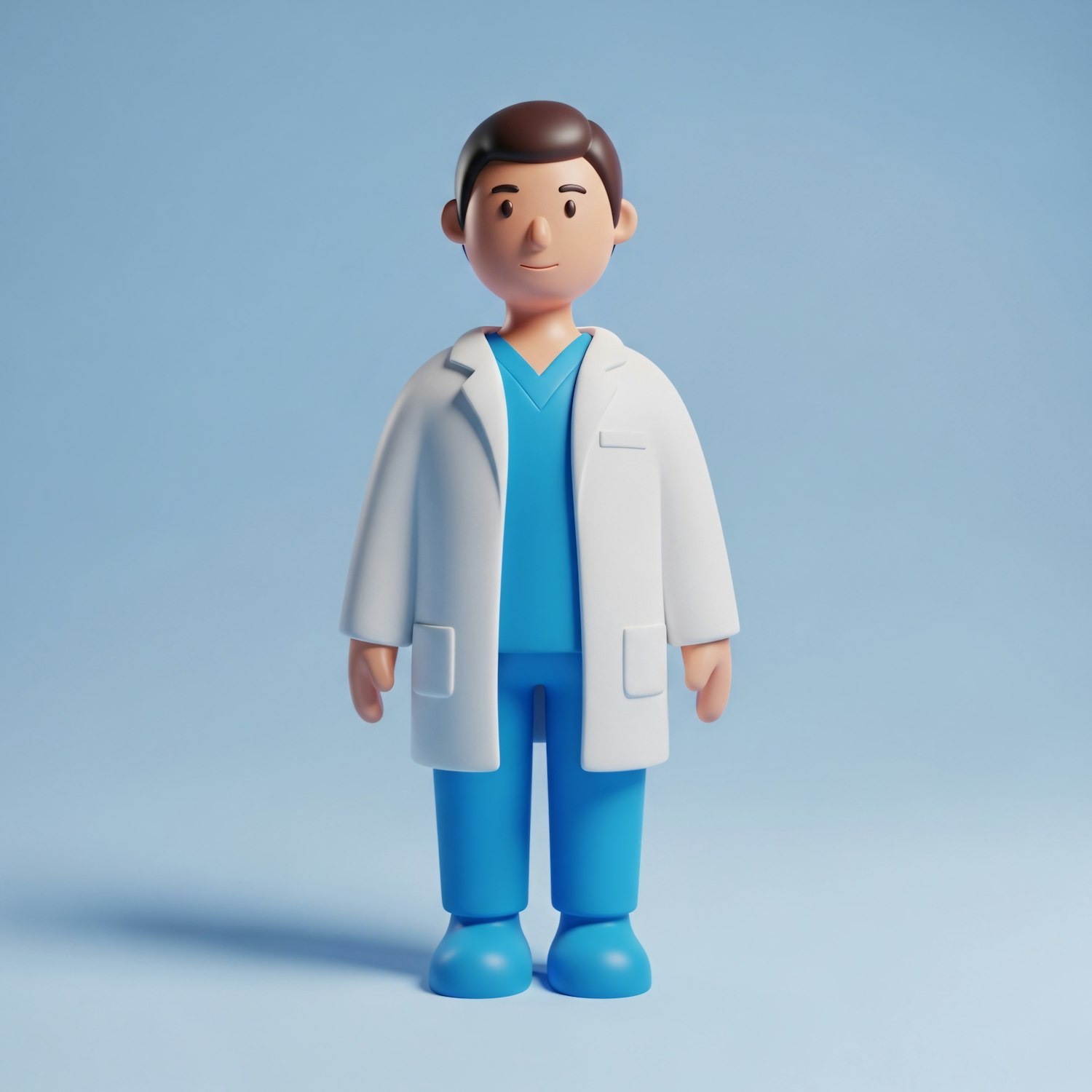 A 3D illustration of a cartoon medical professional in a white coat and blue scrubs, set against a light blue background.
